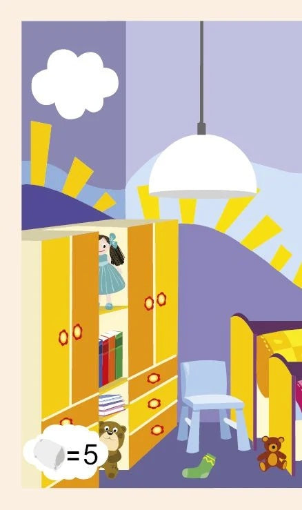 Детето упражнява наблюдателността си, търси и брои предмети. Комплектът съдържа 15 карти, с които могат да се сглобят 1 голям и 5 по-малки пъзела.