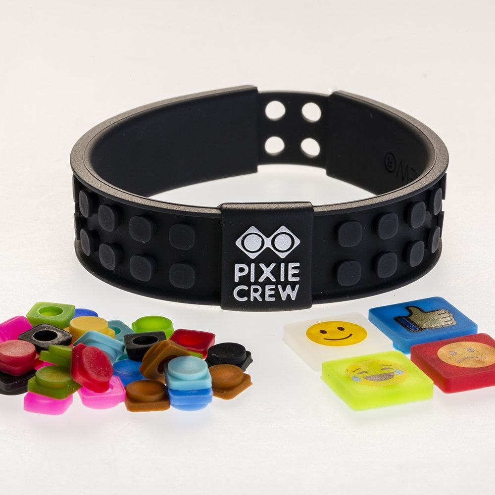 Универсална силиконова гривна, която не е само за деца! Развихрете въображението си и изразете своето настроение със стил. Гривната е с регулируема ширина, което обещава ще пасне на деца от всички възрасти, а черният ѝ цвят я прави чудесен подарък за всеки. Тя може да бъде декорирана по множество пъти и по такива начини, че да отива на облеклото. В комплекта ще откриете 4 мултипиксела и 30 малки многоцветни пиксела. Хубавото е, че пикселите могат да се използват повторно във всички продукти на PIXIE CREW.