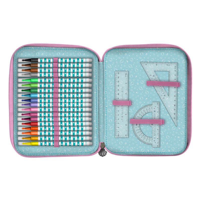 Със своите преливащи се цветове, блестящи акценти и ципове с мидени накрайници несесерът ще придаде океанско усещане в училищните занимания. А във всяко от двете отделения ще намериш всичко необходимо за училище: