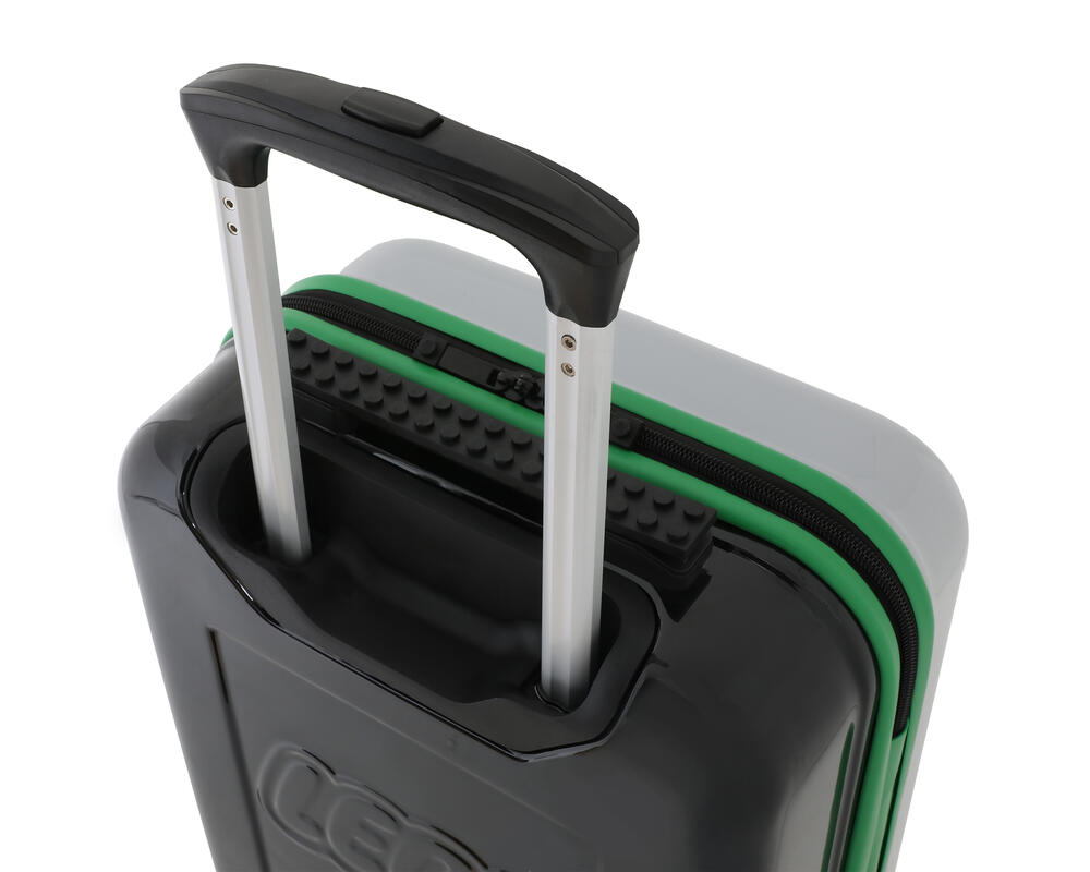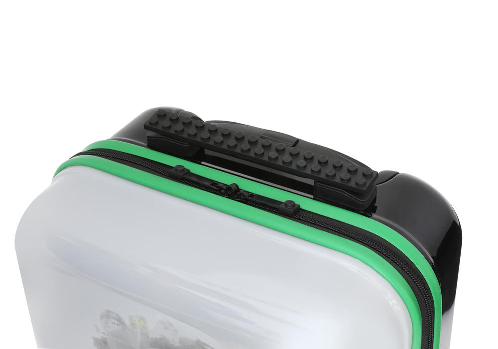 Здрав корпус и ципове. Цветен висококачествен принт LEGO®Ninjago (зелена нинджа  Лойд) отпред. Сиво-зелен фон. Формовано LEGO на гърба. Удобна телескопична дръжка на релса. Ръкохватка с LEGO Brick мотиви.