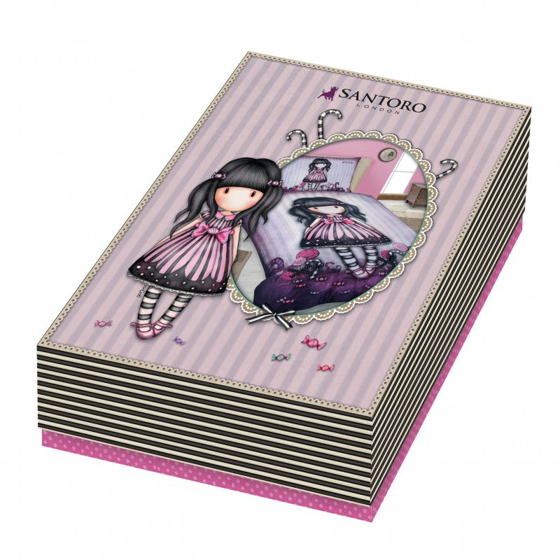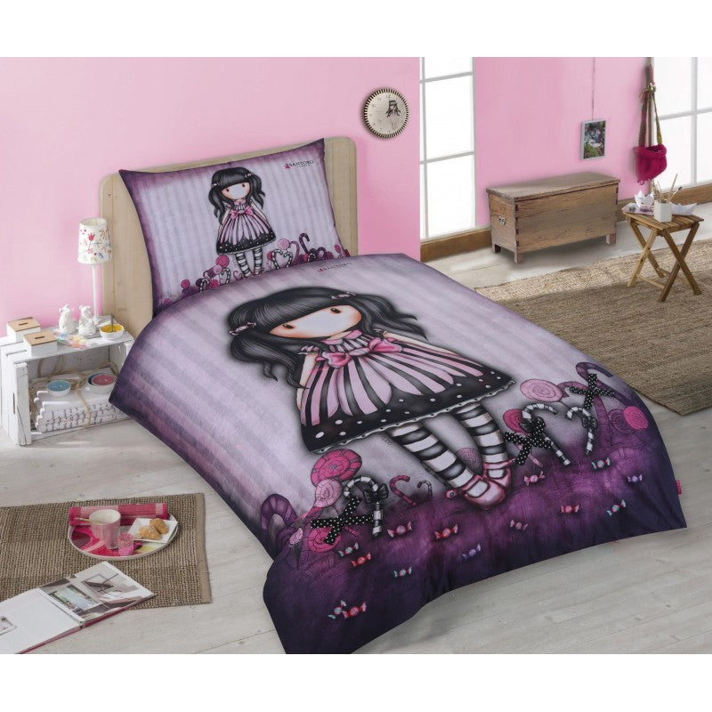 Детският спален комплект Santoro Gorjuss ще пренесе малката ви дама в Страната на чудесата. Изработката му е от 100% памук, който е приятен на допир и обещава спокоен сън. Комплектът се състои от плик за горна завивка в размер 140 х 200 см, който се затваря с цип, предпазвайки завивката от изхлузване, както и от калъфка за възглавница в размер 70 х 90 см. Всичко това е опаковано в луксозна опаковка, представляваща цветна релефна кутия от картон с висококачествен принт. Ако не разполагате с долен чаршаф, можем да ви предложим такъв в цвят екрю, който също е от 100% памук.