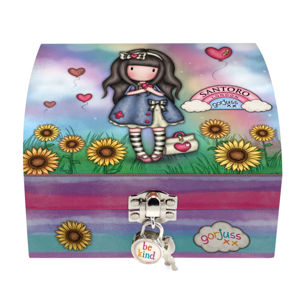 Кутията е в красиви пастелни цветове: розов, лилав и син. Върху капака ѝ, от външната страна е изобразено Gorjuss момиче с тъмно кестеняви коси и синя рокля, държащо сърце в ръцете си. Заобиколено от слънчогледи и летящи балони във формата на сърце. От вътре кутията е в пастелно розово и синьо на бледи дъги и с изобразено момиче Gorjuss, от вътрешната страна на капака.