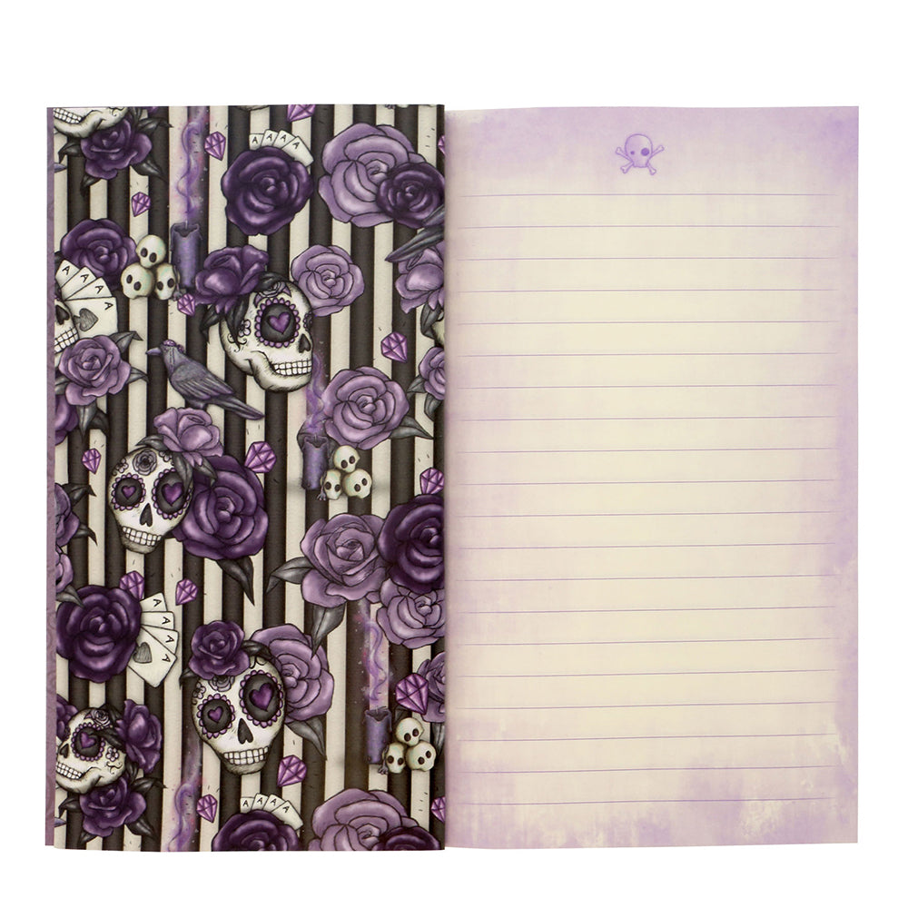 2 броя тетрадки в комплект с картонена стойка . Всяка тетрадка има по 200 страници с редове ( на едната те са в бледо синя осонва, а на другата в бледо лилава). По средата има бележник с 40 черни страници.