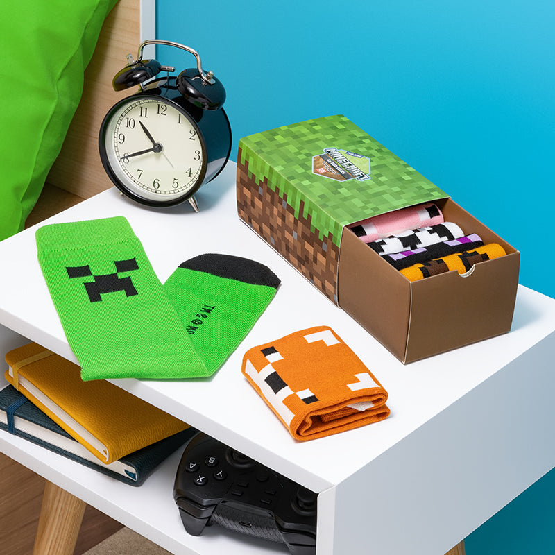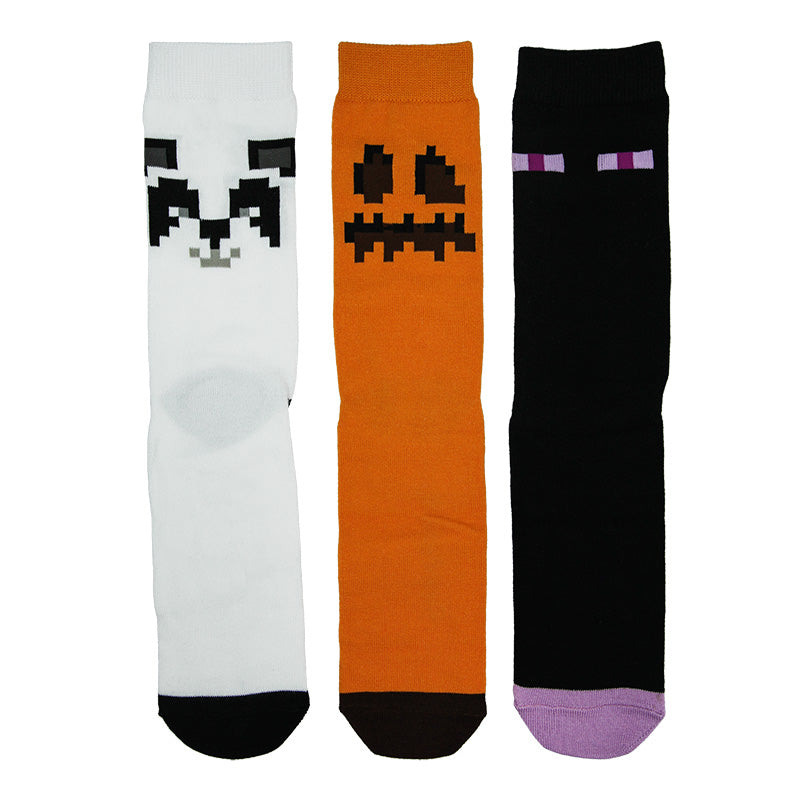 Тези странни чорапи на Minecraft се отличават със забавеният си дизайн, който можете да комбинирате ot 6 различни чорапа. Дизайнът включва познати Minecraft герои като Snow Golem, Enderman, Creeper, Fox, Panda и Pig. Цветният пикселиран модел е уникален и привличащ вниманието. Забавните чорапи със сигурност ще зарадват всеки фен и любител на Minecraft. Унисекс чорапите са подходящи за размер от 36 до 41 номер.