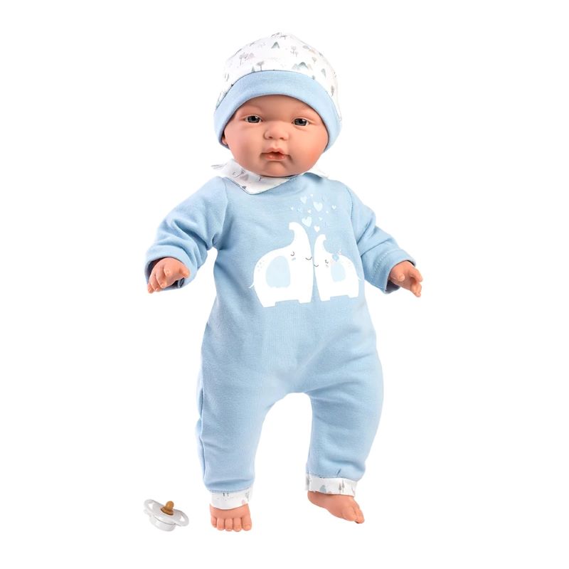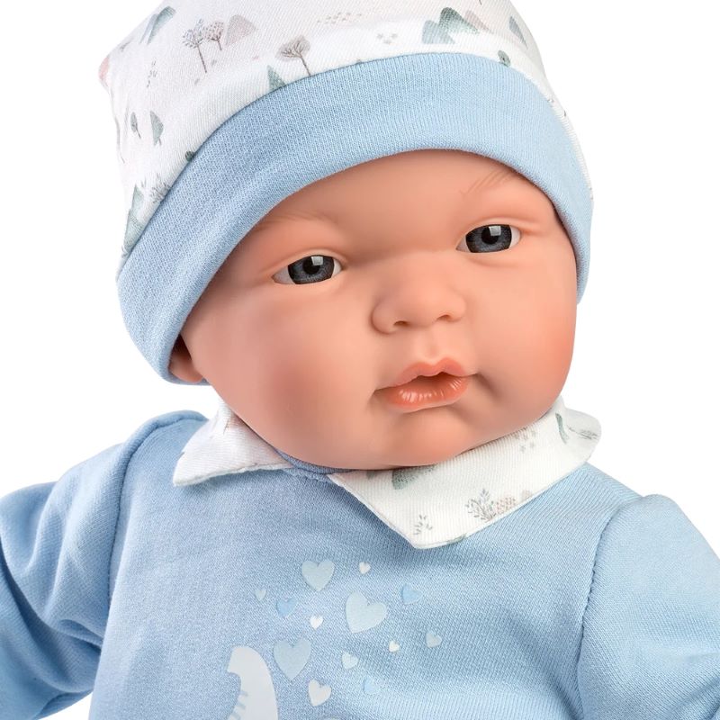 Ръчно изработена кукла Joel. Облечена е с малка синя пижама с якичка и шапка на главата.