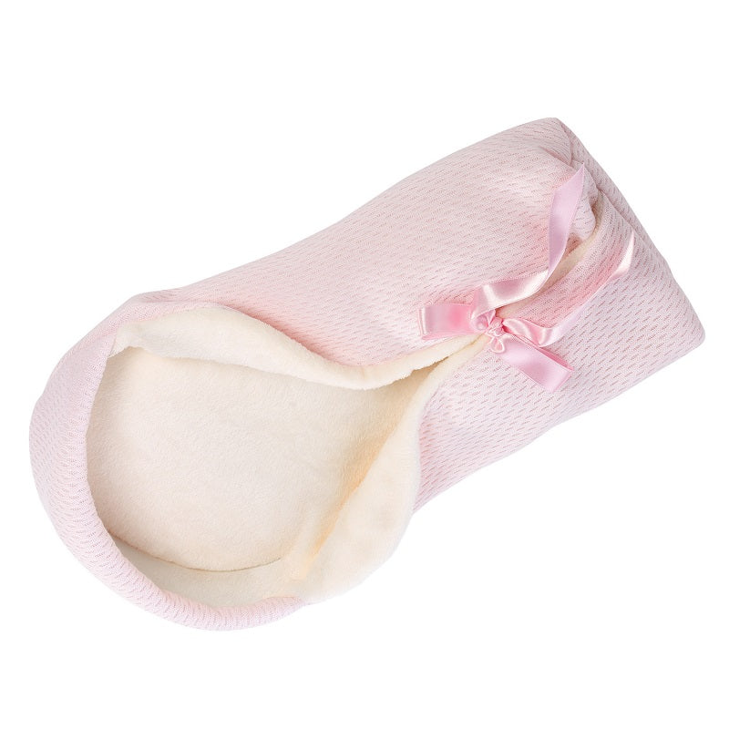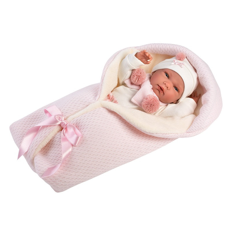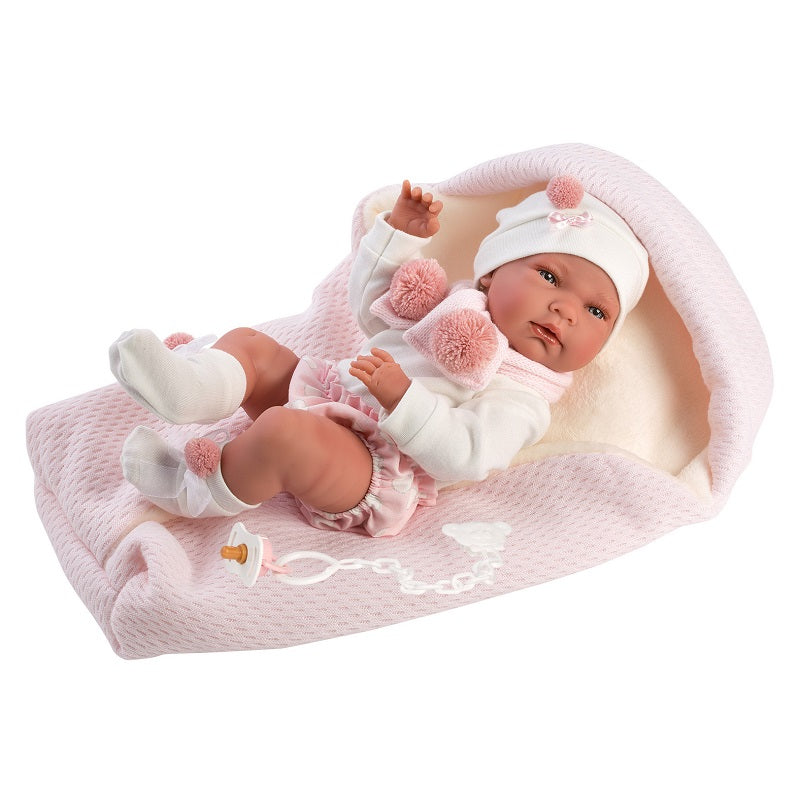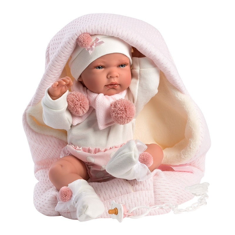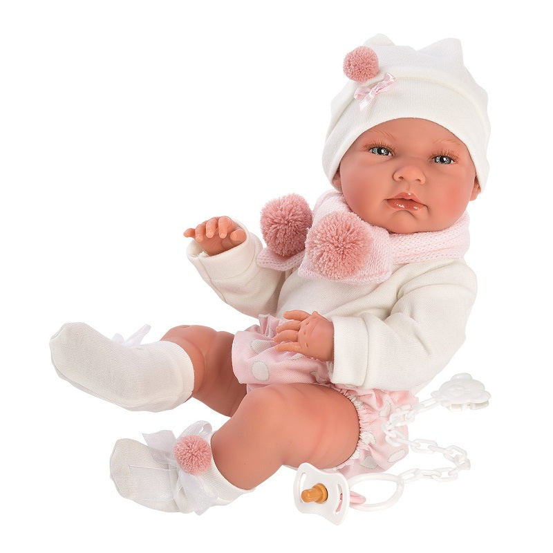 Тяло от винил, розови дрешки, бяла шапка и пеленка. Декоративен биберон.