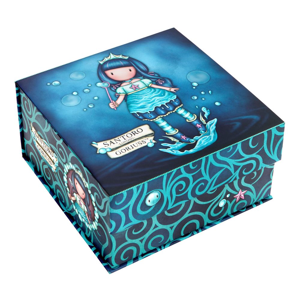 Тази красива кутия за съхранение е в син дизайн на вълни, от външната страна, а върху капака ѝ е изобразено Gorjuss момиче със сини коси на опашки, облечено в ефирна рокля от вълнички. От вътре кутията е в нежно розово на бледи звезди и мехурчета, а капака е на синьо райе, върху което отново е изобразена "Ходещата по вода" Gorjuss.