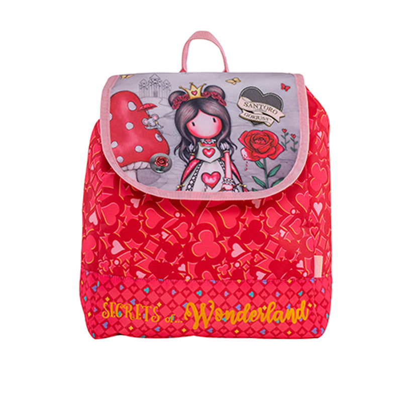 Красив червен дизайн, разнообразенс цветни елементи и фигури. Надпис Secrets of...Wonderland в долната част на раницата.