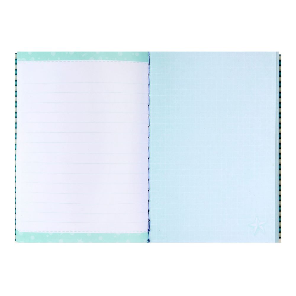 Тетрадката разполага с 38 страници с широки редове, като всяка страница отгоре и отдолу е декорирана със светло синьо поле на морски звесди и мехурчета. И с 38 страници на малки квадратчета в светло син цвят, като всяка страница е декорирана с морска звезда в долния ъгъл.