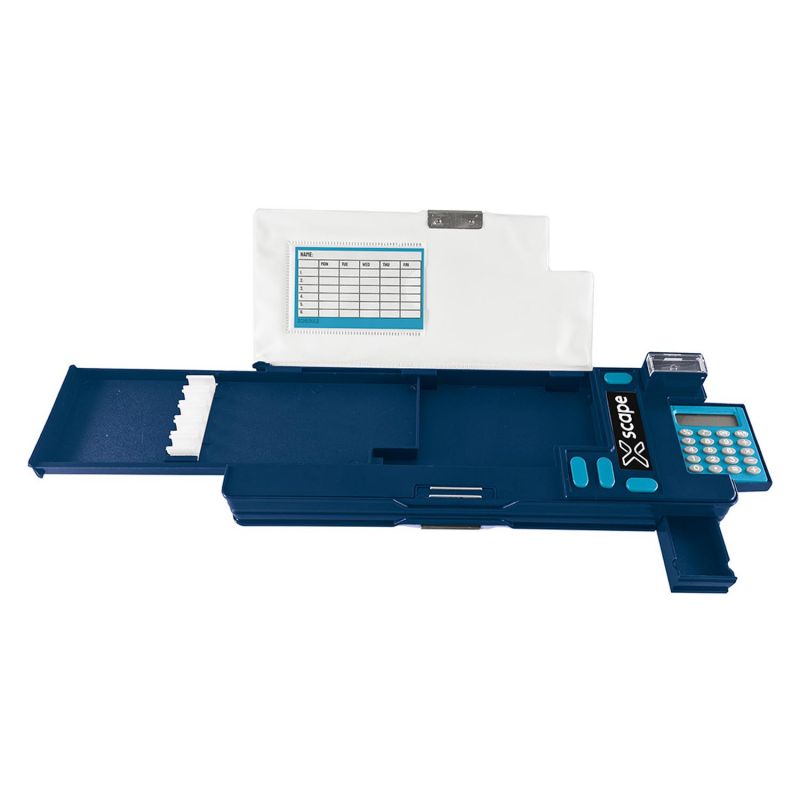 Ученическа програма от вътрешната страна. Етикет за името на задния панел.Четири бутона задействат различни автоматични отваряния: две мини тайни чекмеджета, острилка и калкулатор.