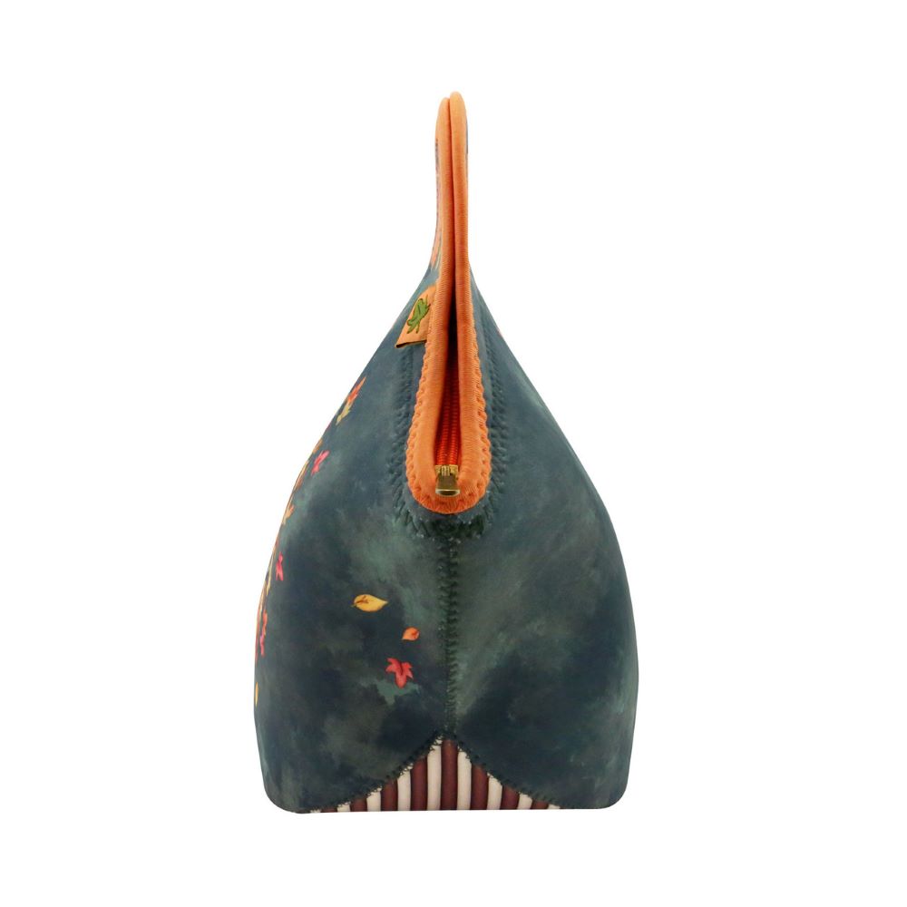 Приказна лайфстаил чанта за момиче. Подходяща още за съхранение на пакетиран обяд. Мека и елегантна, удобна за носене.Едно основно отделение. Затваря се със здрав цип с емайлиран накрайник.Дръжките са обточени с оранжева лента. Отпред принт на Gorjuss момиче с тъмни коси и обсипана с шарени есенни листа. Катеричка в краката ѝ.