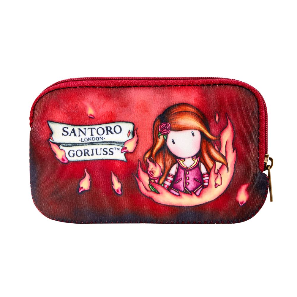 Портмонето е с красив дизайн в червено, наподобяващ огнени пламъци. В предната му страна е изобразено Gorjuss момиче с роза в косите, заобиколено от пламъчета. На гърба на несесера е изобразено логото на марката. От вътре несесерът е в оранжав цвят, затваря се с цип с метален накрайник, с логото на Santoro.