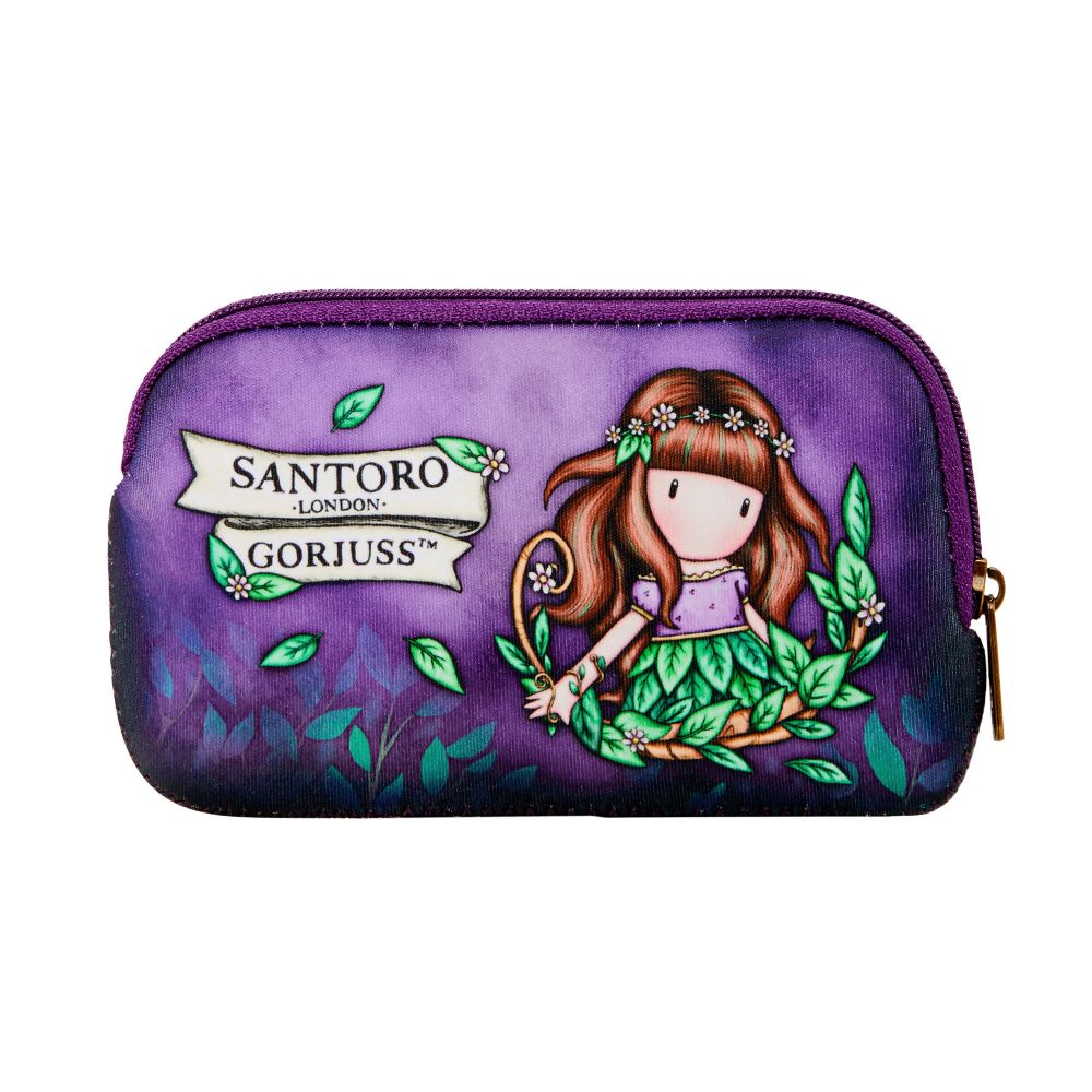 Портмонето е с красив дизайн в лилаво и зелено, наподобяващ листа. В предната му страна е изобразено Gorjuss момиче с венец от цветя в косите, заобиколено от клонки и листа. На гърба на несесера е изобразено логото на марката. От вътре несесерът е в лилав цвят, затваря се с цип с метален накрайник, с логото на Santoro.
