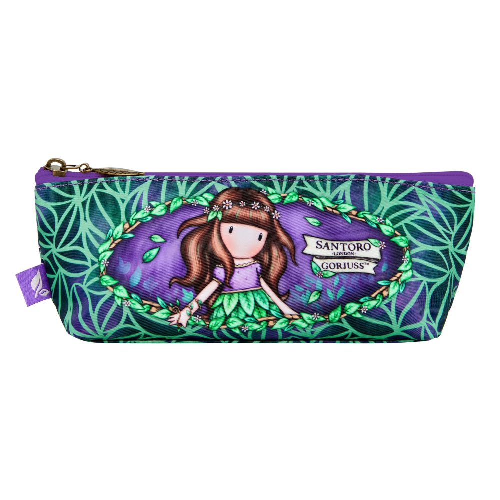 Несесерът е с красив дизайн в лилаво и зелено, наподобяващ листа. В предната му страна е изобразено Gorjuss момиче с венец от цветя в косите, заобиколено от клонки и листа. На гърба на несесера е пришит етикет от кожа и дърво с гравирано логото на марката. Отстрани има пришито нежно платнено етикетче, с бродирани листа от едната страна и текст Gorjuss от другата. От вътре несесера е с хастар на лилаво райе, един от характерните елементи в дизайните на Gorjuss.
