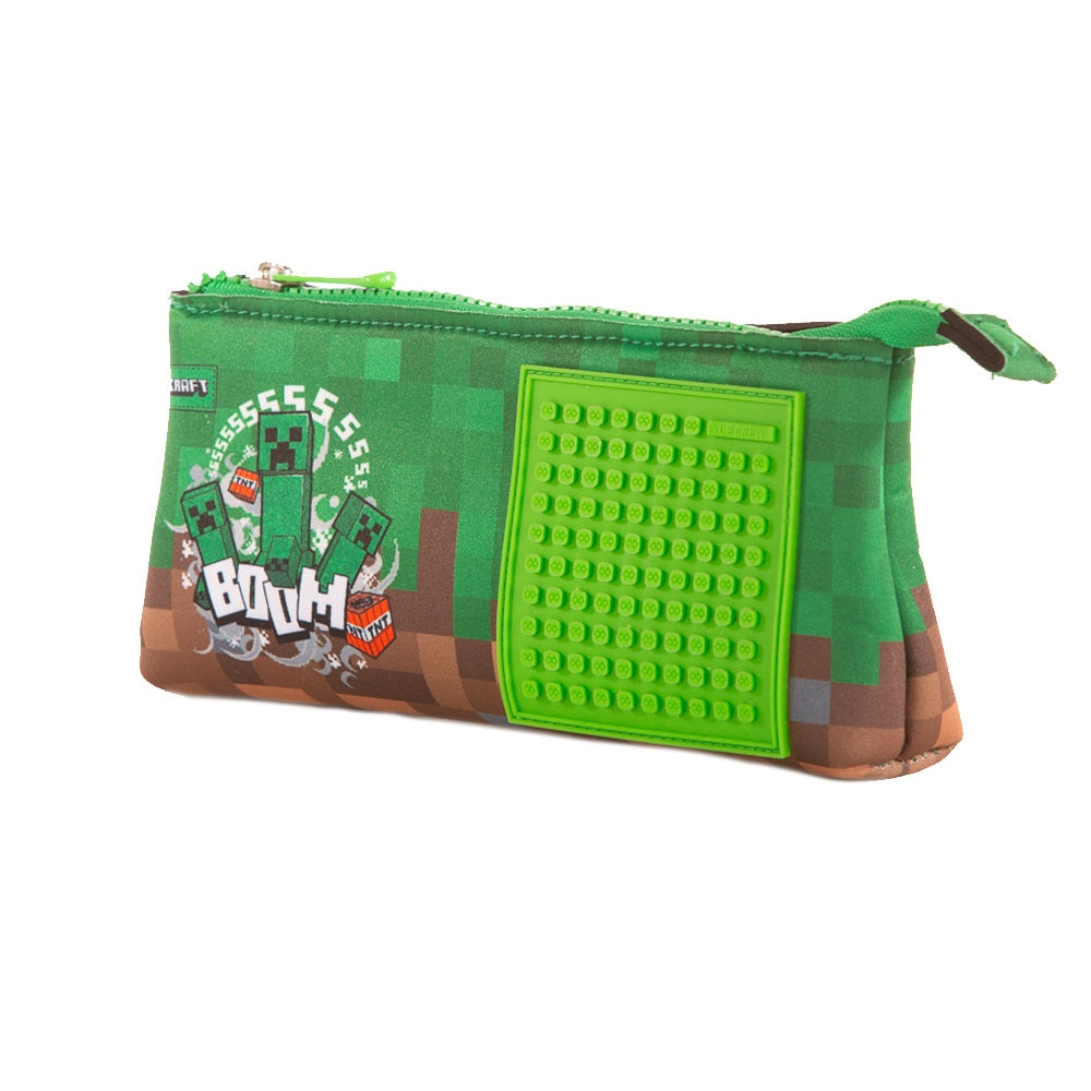 Висококачествен принт на ssSSSSSss BOOM, MINECRAFT върху основа от зелени и кафяви блокчета. Здрава, промазана, неопрен материя за лесно почистване. Класически зелен силиконов панел Pixie Crew 8х8 см с пинчета за подреждане и кликване на пиксели. 50 черни силиконови пиксела в комплекта. Здрав цип със зелен метален накрайник. Пришит MINECRAFT текстилен етикет.