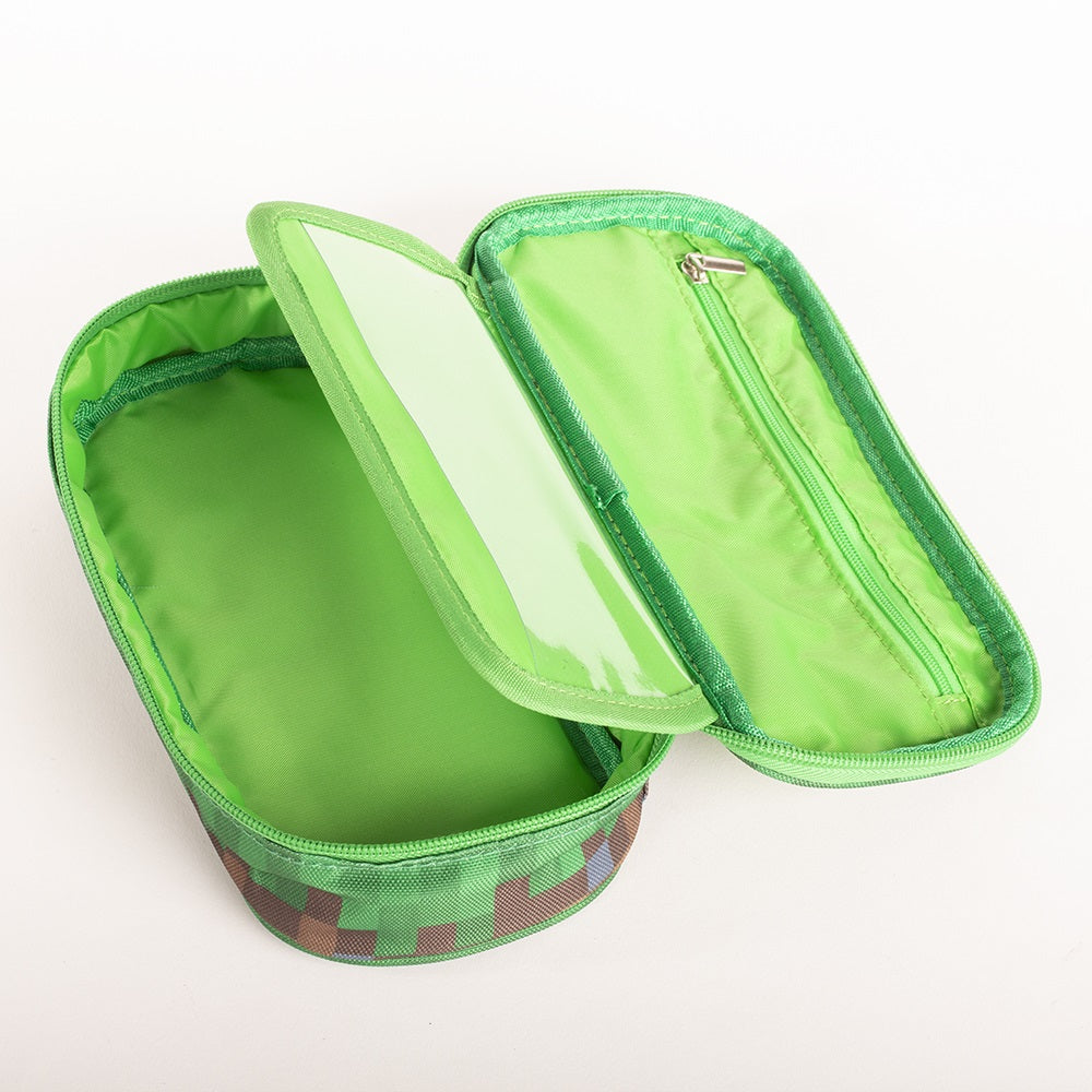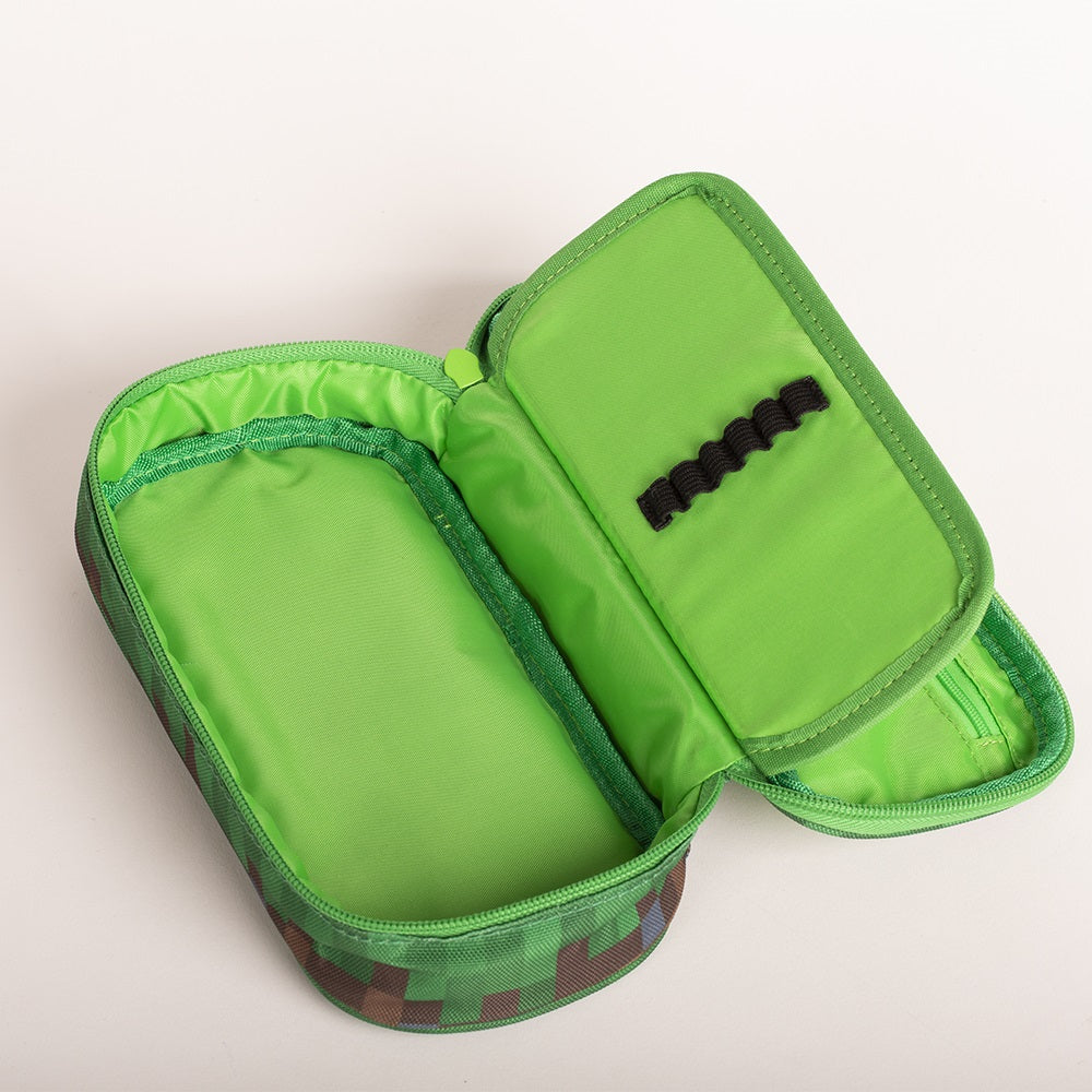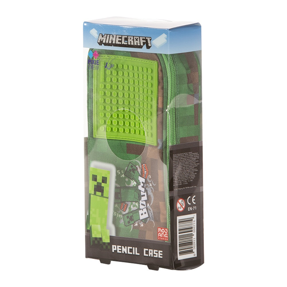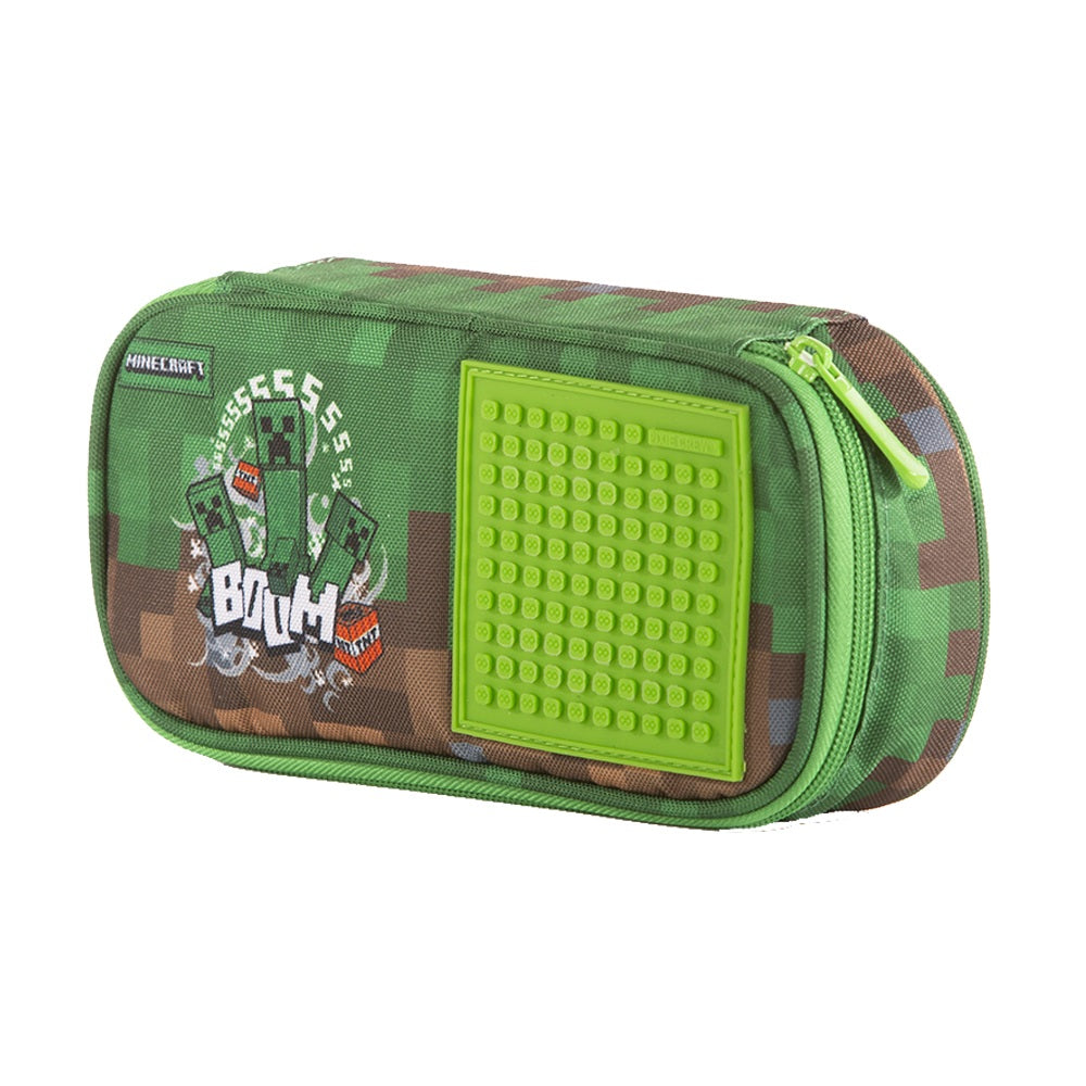 Висококачествен принт на ssSSSSSss BOOM, MINECRAFT на преден панел върху основа от зелени и кафяви блокчета. Здрава, промазана, материя за лесно почистване. Класически зелен силиконов панел Pixie Crew 8х8 см с пинчета за подреждане и кликване на пиксели. 50 черни силиконови пиксела в комллекта. Здрав цип със зелен метален накрайник. Пришит MINECRAFT текстилен етикет.