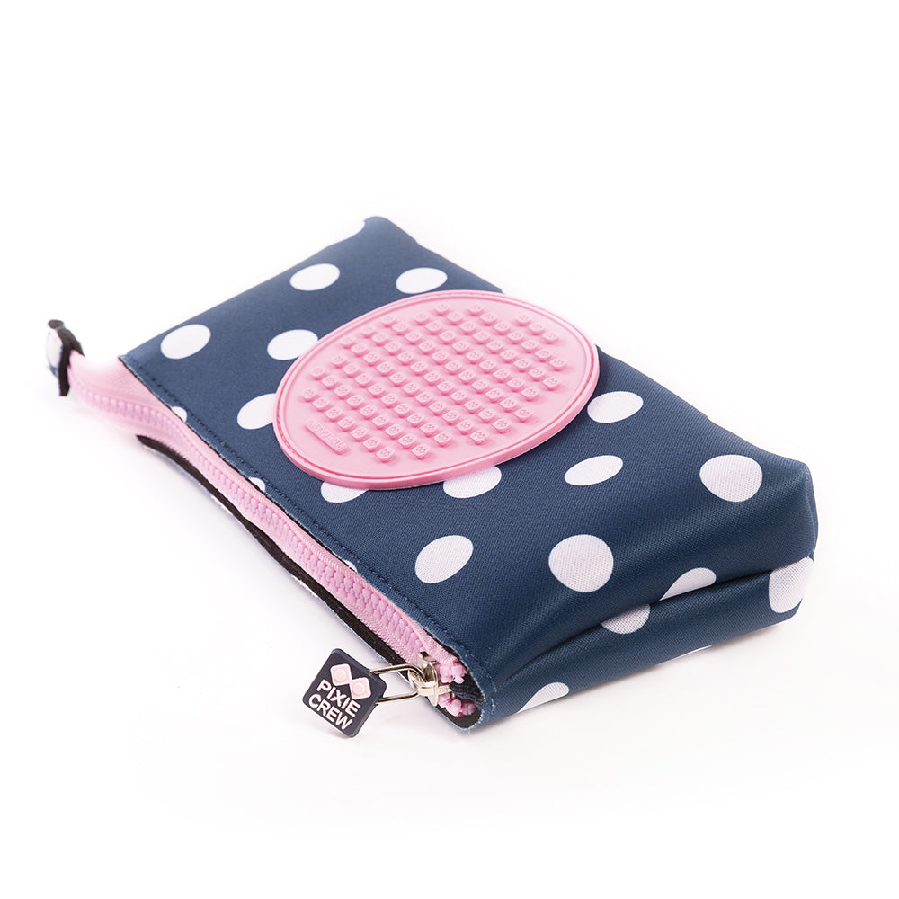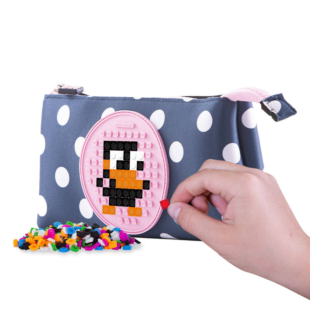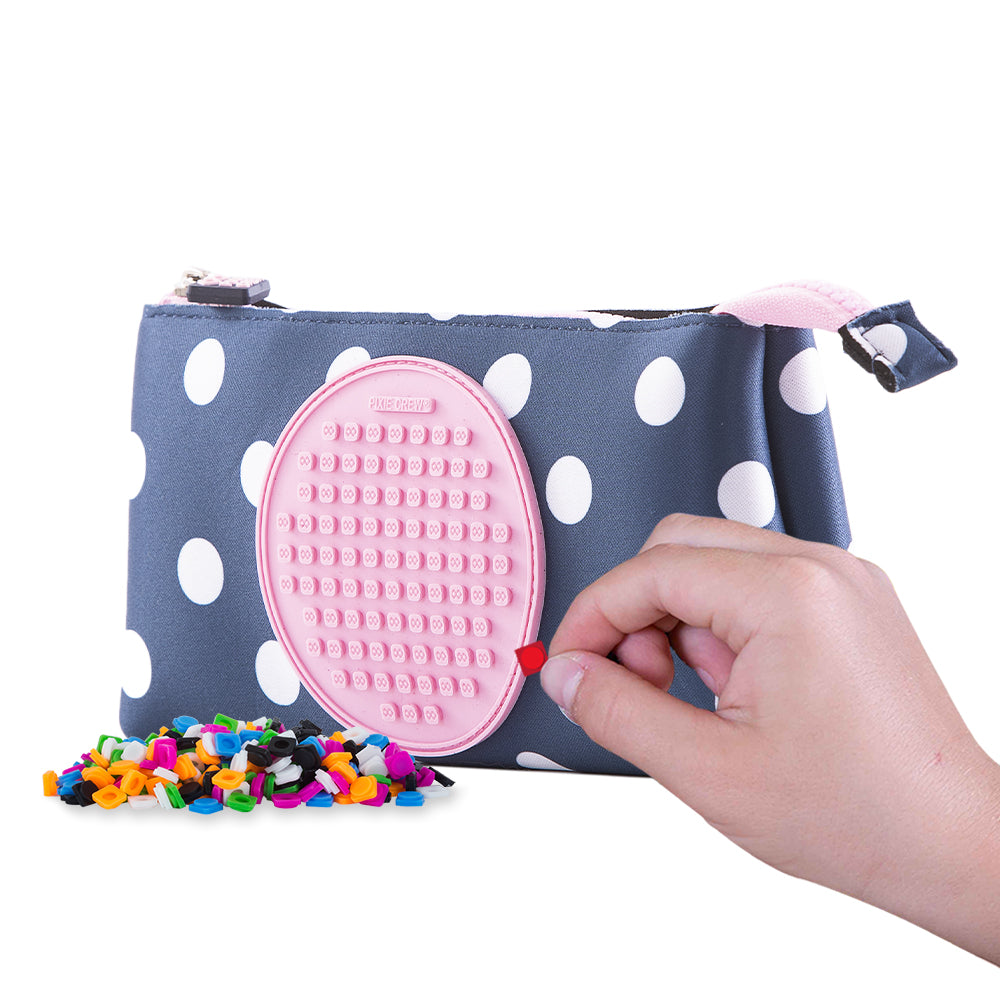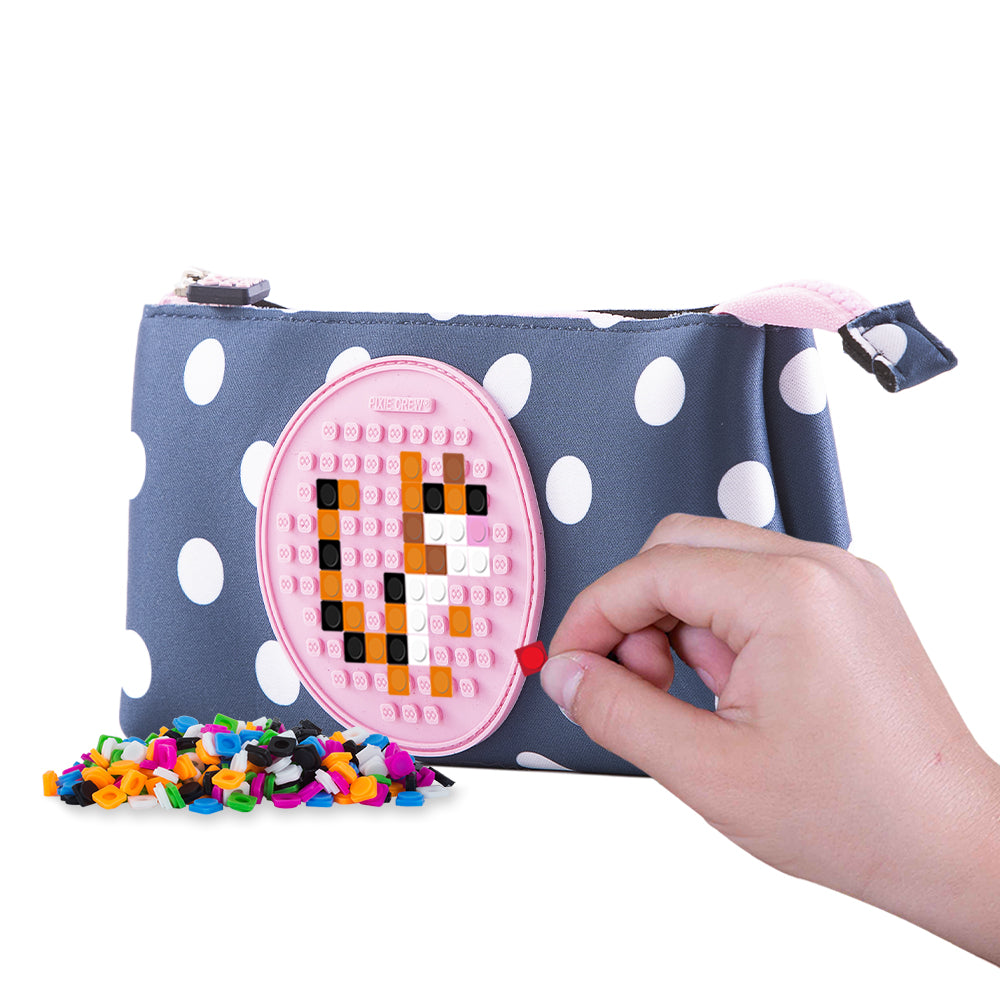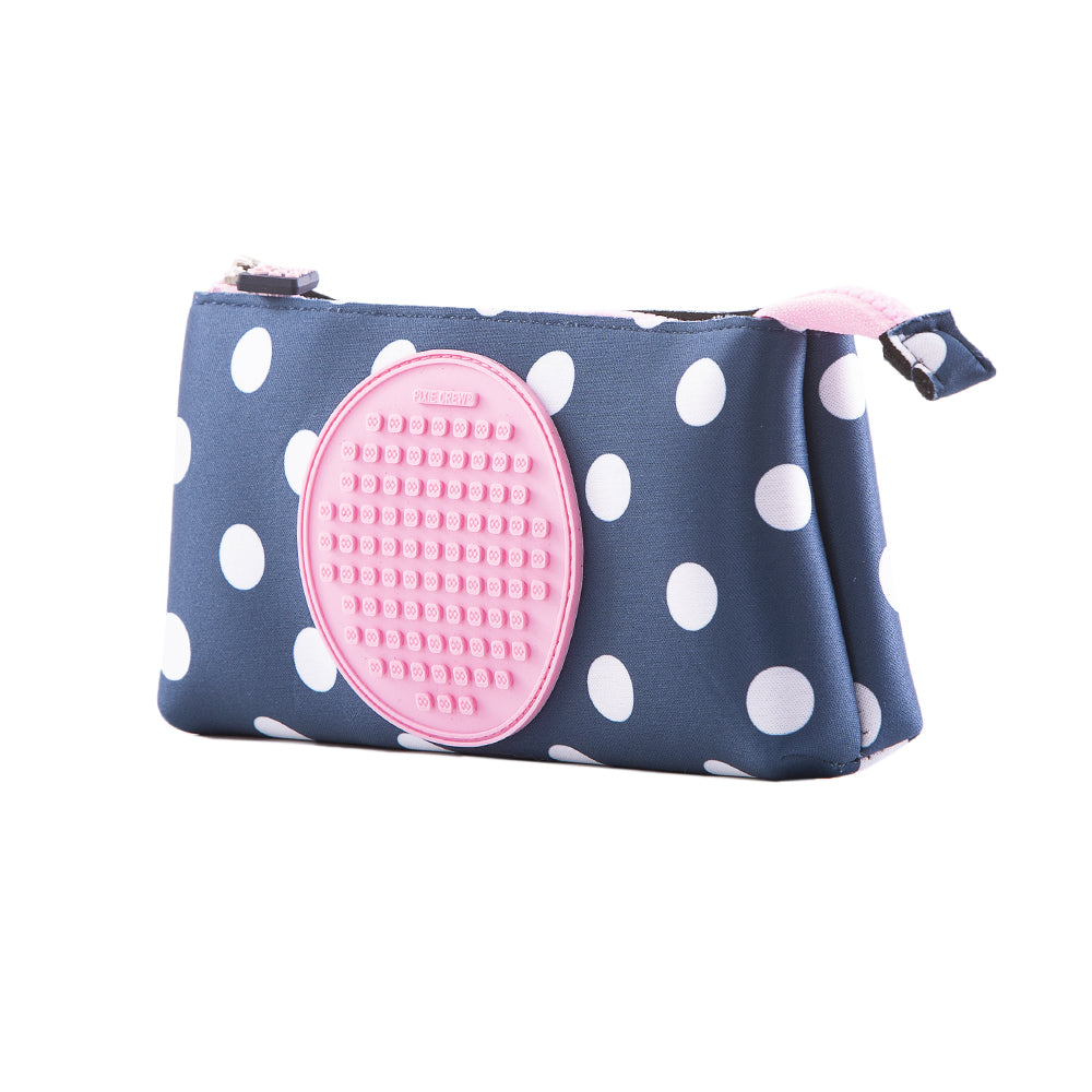 Модерен сив несесер Pixie Crew на бели точки. Разполага с едно отделение и се затваря със здрав цип с гумен, квадратен накрайник. Подходящ за съхранение на ученически пособия като моливи, писалки и други необходими канцеларски аксесоари.Благодарение на силиконовия панел, детето ще може да сменя дизайна на портмонето всеки ден, подреждайки всички многоцветни пиксела в комплекта.