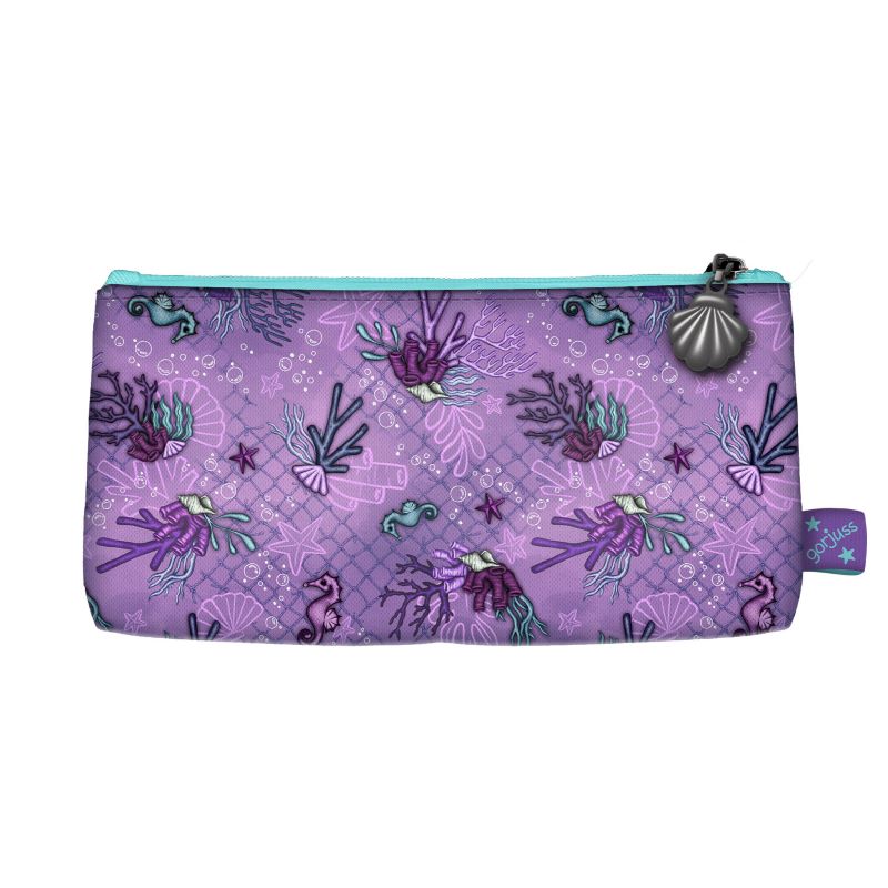 Несесерът е с едно отделение, затваря се с цип, с метален накрайник във формата на мида. Подходящ е за съхранение на моливи, химикали и други дребни ученически пособия.