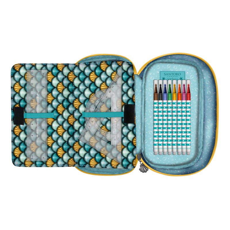 Несесерът е с едно отделение, но в него има всичко необходимо за ученика, организирано по-възможно най-добрия начин. А дизайнът му е изцяло вдъхновен от морското дъно, с преливащи се блестящи акценти и миден накрайник на ципа.