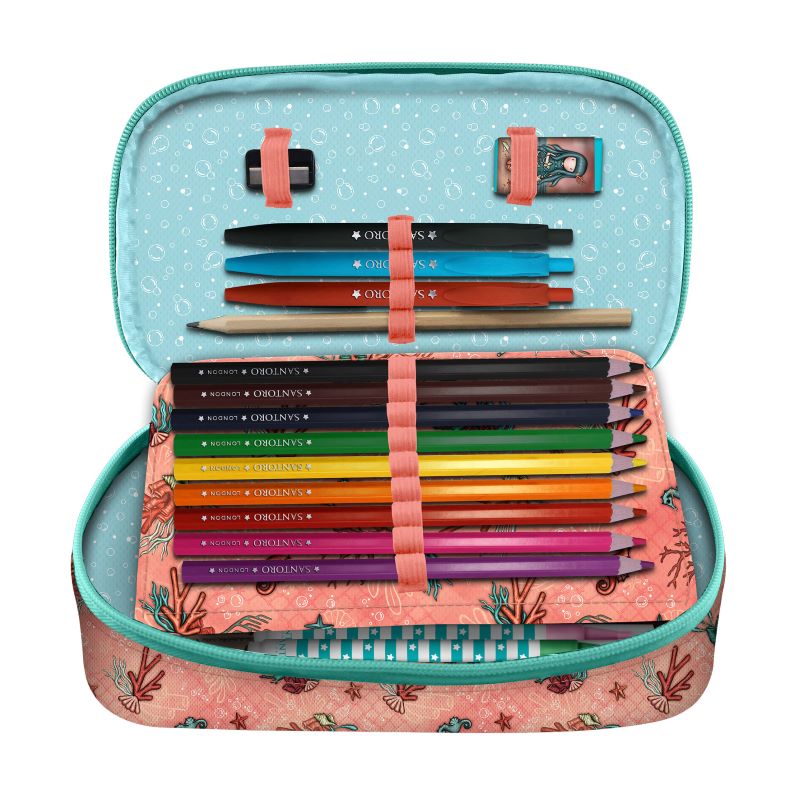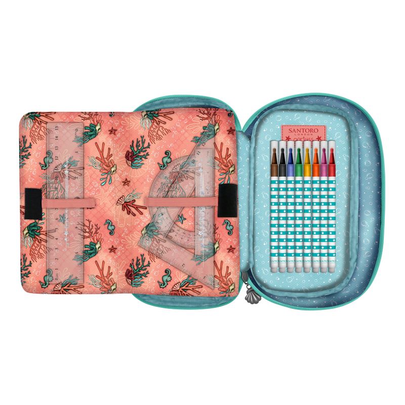 Несесерът е с едно отделение, но в него има всичко необходимо за ученика, организирано по-възможно най-добрия начин. А дизайнът му е изцяло вдъхновен от океанските брегове, с преливащи се блестящи акценти и миден накрайник на ципа.