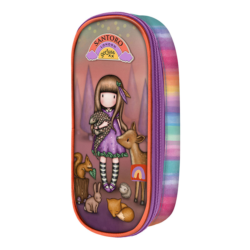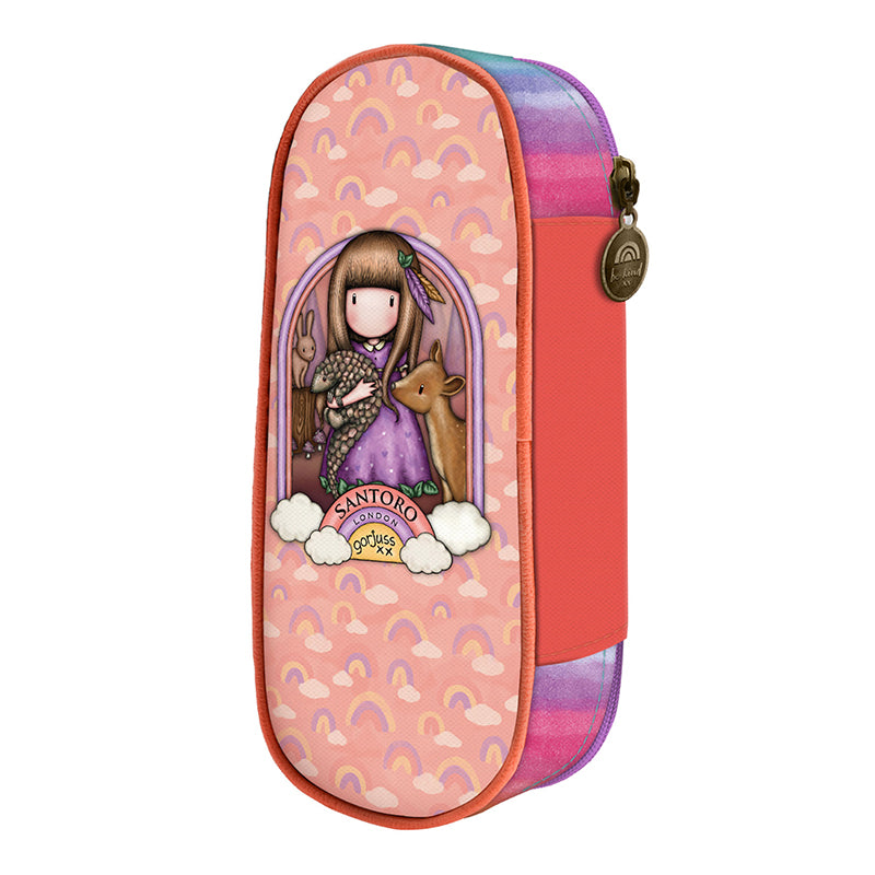 Ученически объл несесер ,,Be Kind To All Creatures” с едно голямо отделение. Удобен за ученически пособия като химикалки, моливи и линия. Отвътре несесерът е оранжев и има джоб, в който може се да сложи гума, острилка или нещо малко. Метален объл цип с логото на Santoro Gorjuss и надпис ,,Be Kind”. Размери: 10 х 23 х 6 см