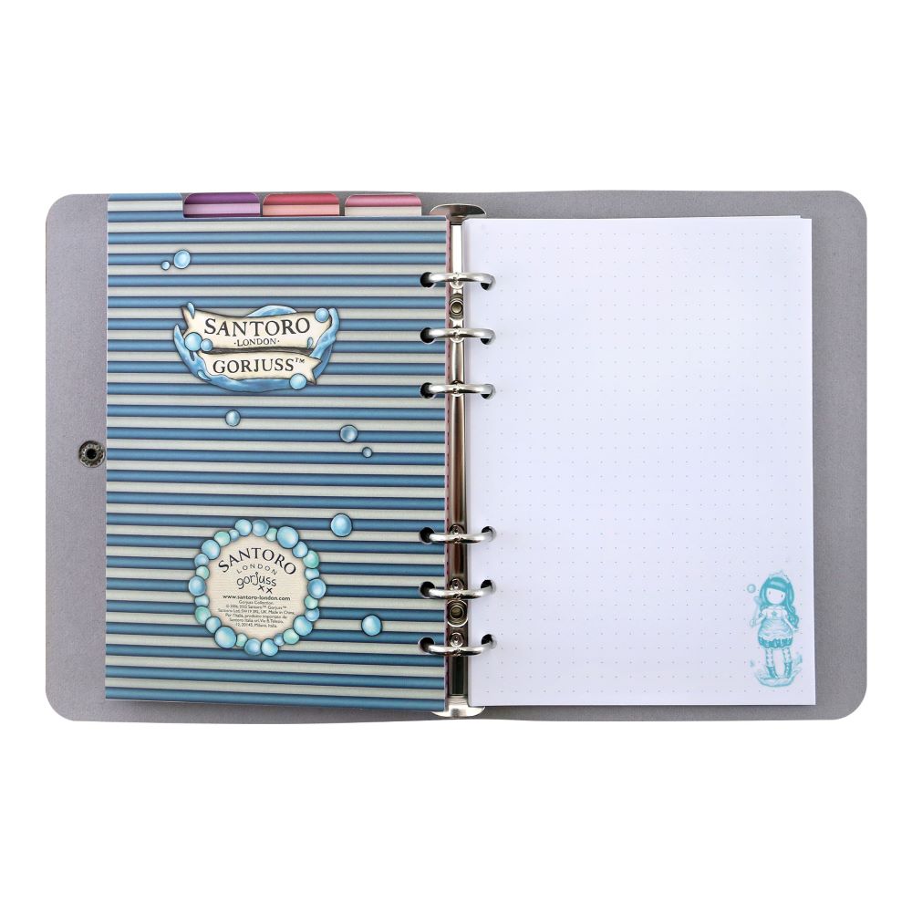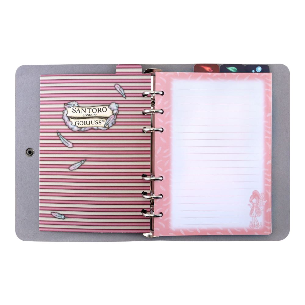 За да организирате добре времето си, органайзерът е разделен на четири раздела. Като всеки от тях съответства на визията на едно от четирите Gorjuss момичета, от колекцията Elements. Има метални рингове, които могат да се отворят, ако искате да премахнете някоя ненужна страница. Разполага и с тик-так закопчалка, за да са на сигурно място записките ви.
