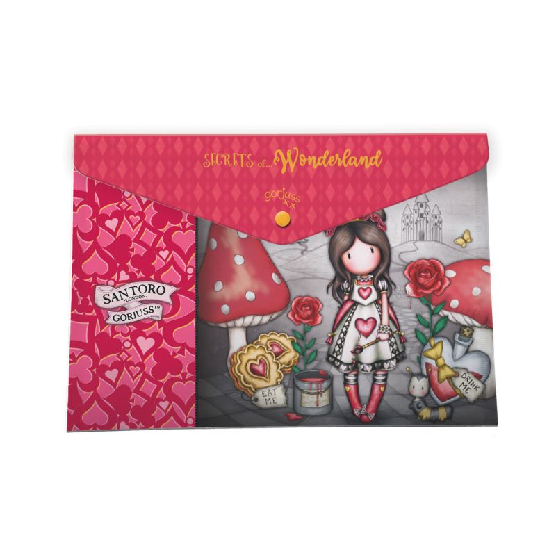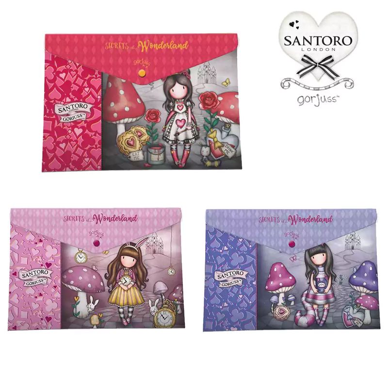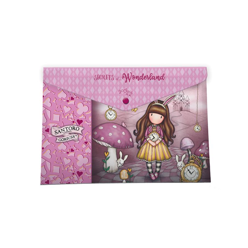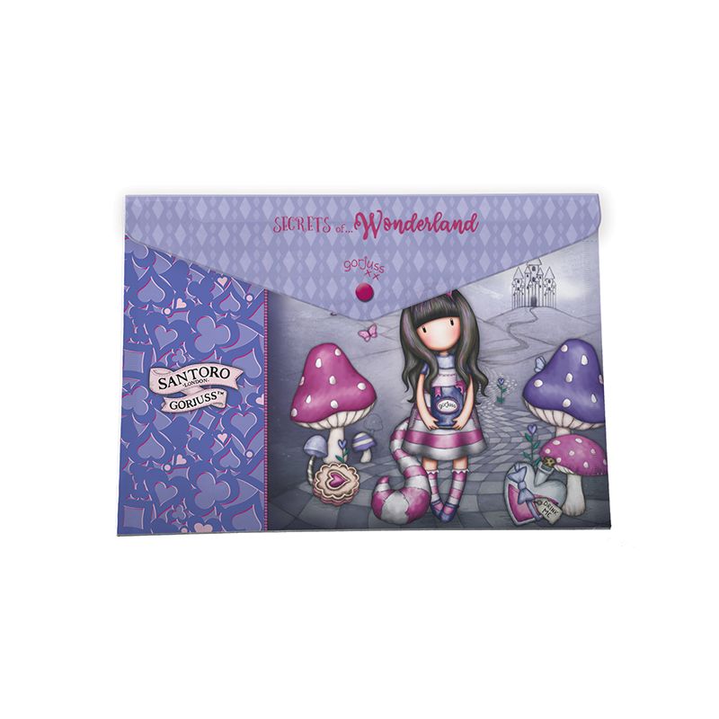 Папката Santoro Gorjuss е идеална за съхранение на документи или записки с формат А4, а удобното затваряне с копче улеснява използването ѝ. Папката се предлага в три цветни дизайна с Gorjuss момичетата от колекциите Finding My Way, Just One Second и Cheshire Cat.