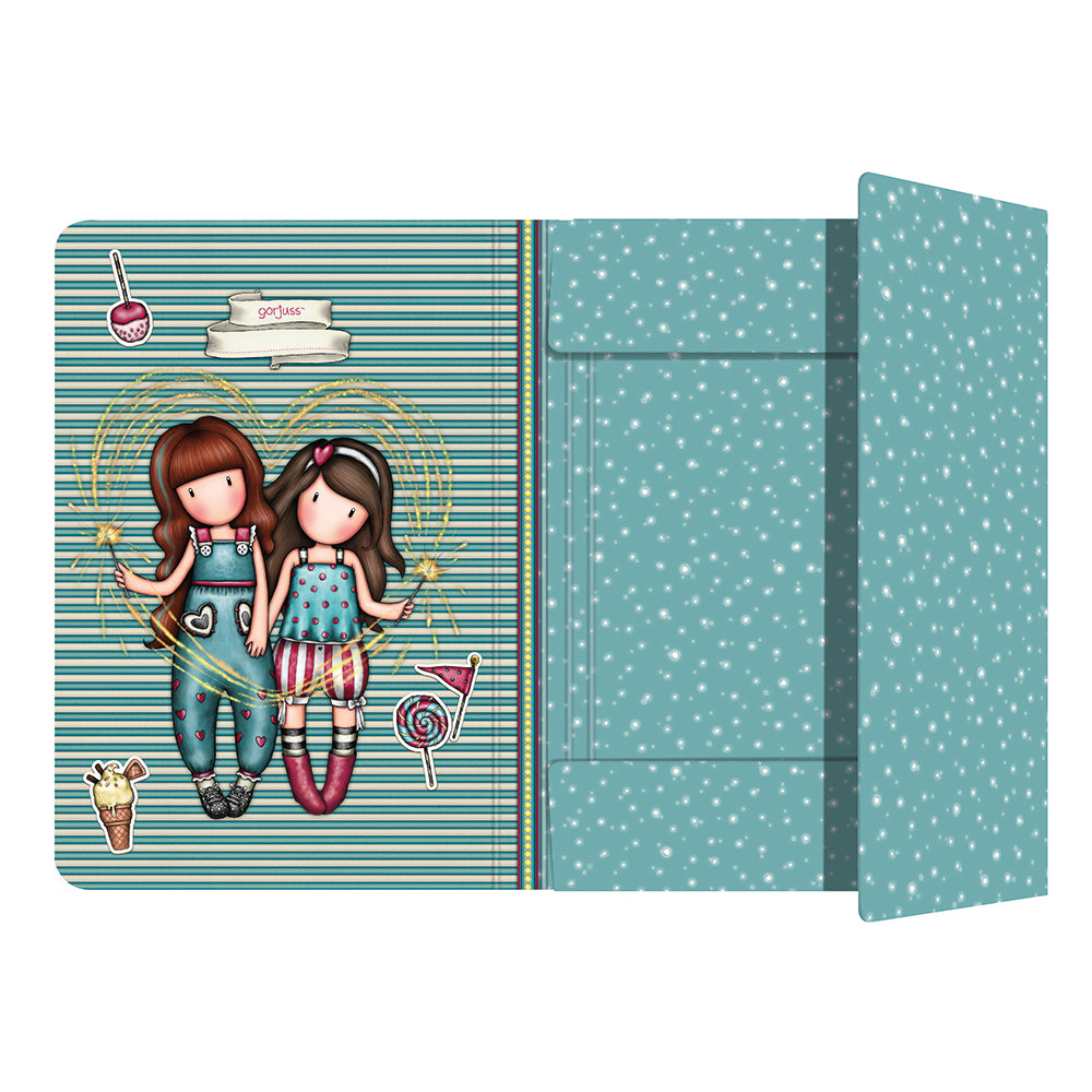 Папката за момичета с розов ластик в тюркоазен цвят. Подходяща за съхранение на документи и листове, формат А4. Отпред принт на Gorjuss момичета държат бенгалски огън. Близалки, сладолед, захарен памук, мечета и балони.