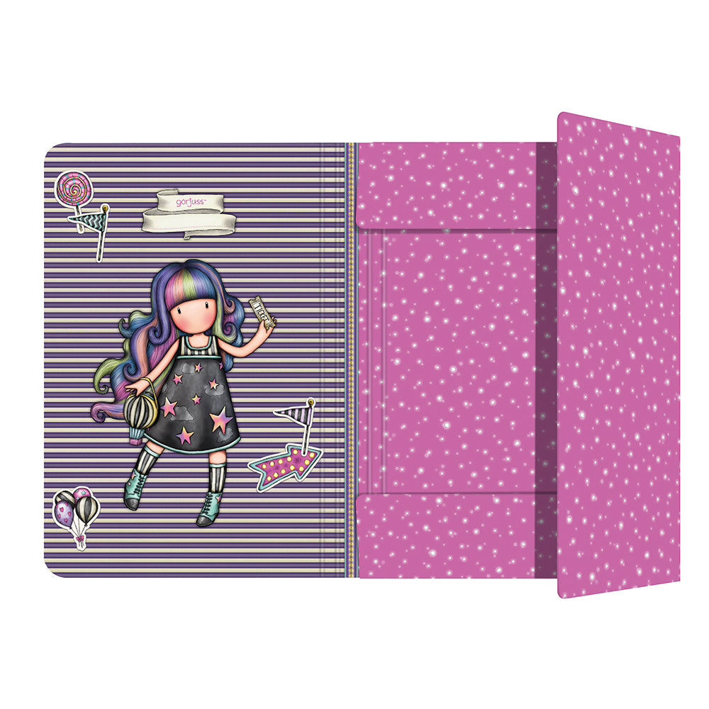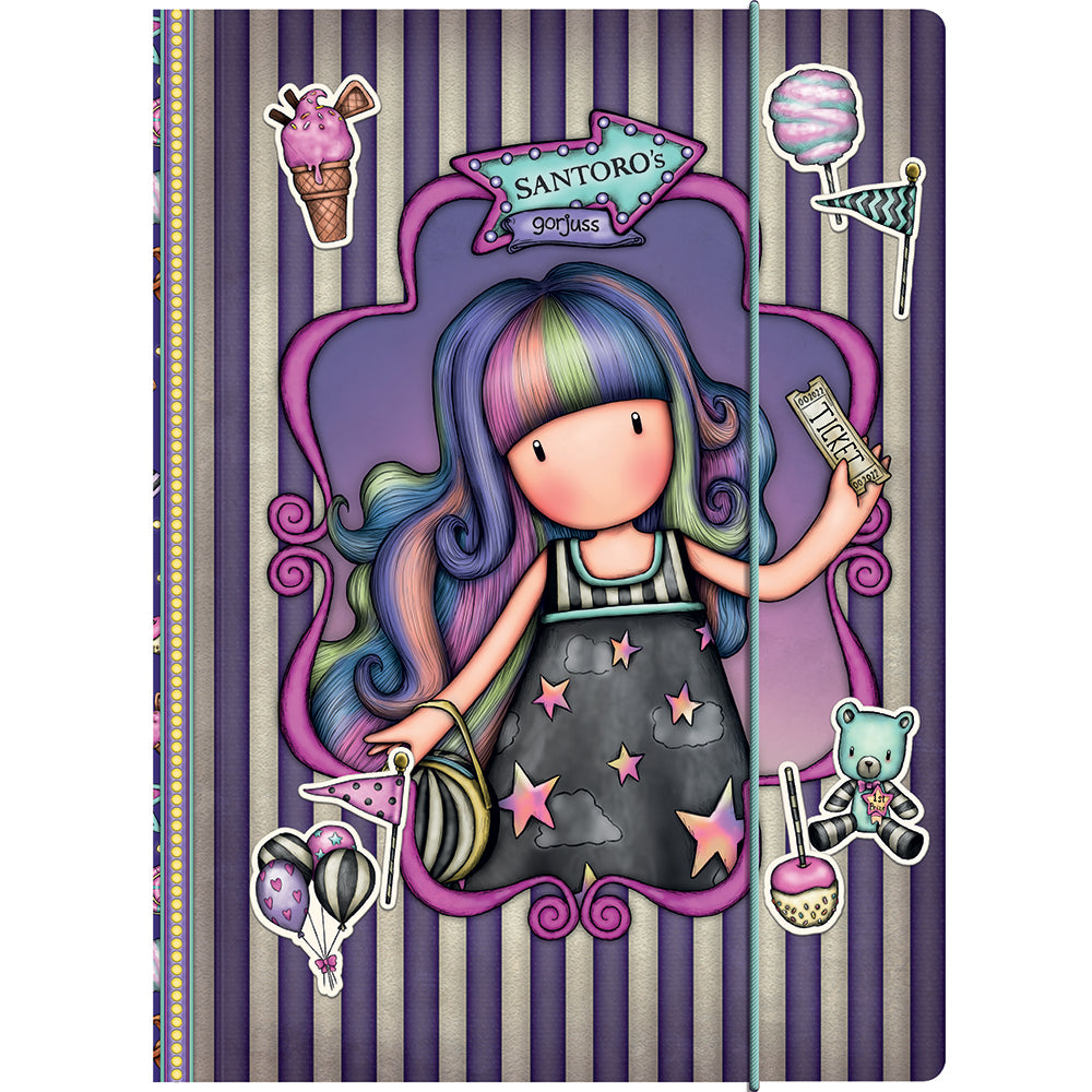 Папката за момичета с розов ластик в лилав цвят. Подходяща за съхранение на документи и листове, формат А4. Отпред принт на Gorjuss момиче с билет за панаир в ръка. Близалки, сладолед, захарен памук и балони.