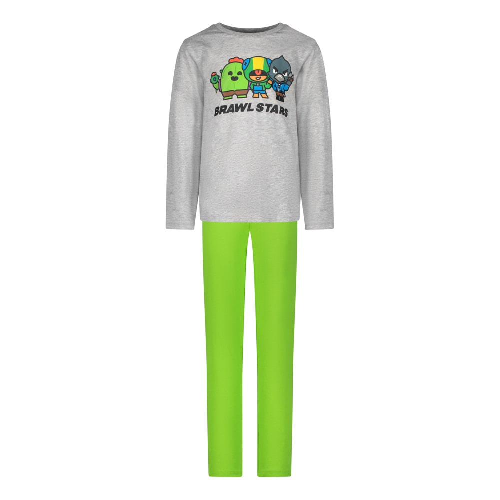 За спокойни сънища, изпълнени с игри, всеки малък геймър има нужда от комфортна пижама. Памучната такава на Brawl Stars е с дълги ръкави и дълги панталони, гарантиращи уют и топлина в по-студените нощи. Главни участници в дизайна на горната част са Леон, Кроу и Спайк, които са на сив фон, а панталонът е в свеж зелен цвят.