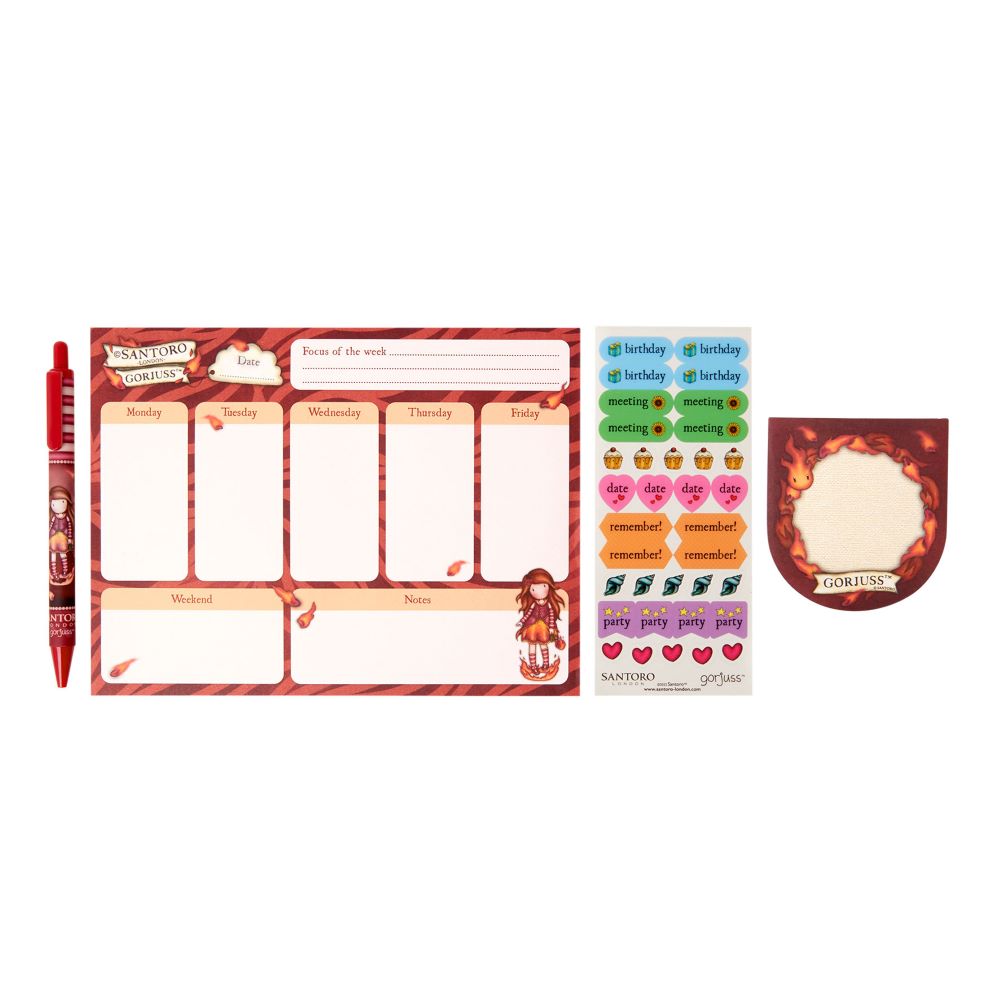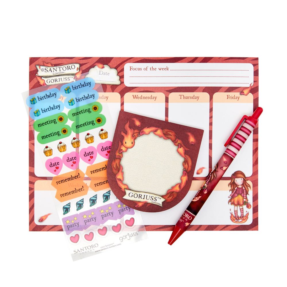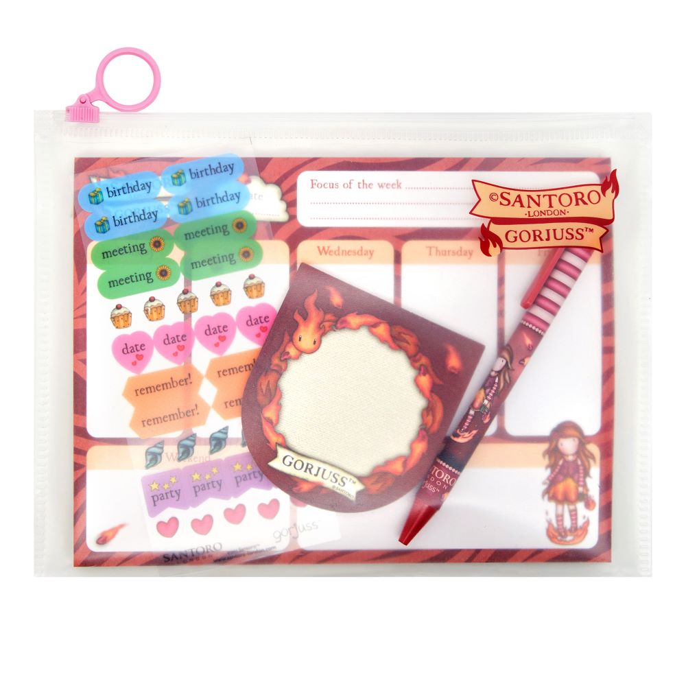 Сетът е в красив розов дизайн на ппламъци, съответстващ на визията на "Момичето с огнено сърце" Gorjuss, от колекцията Elements. Състои се от 5 части: химикал, планер, лепящи листчета, мини стикери и прозрачен джоб с цип, в който да приберете всичко.