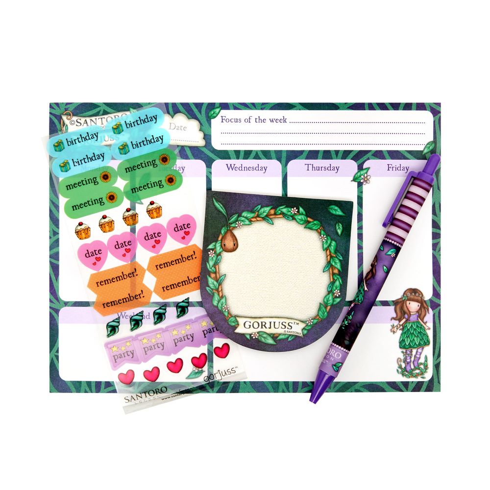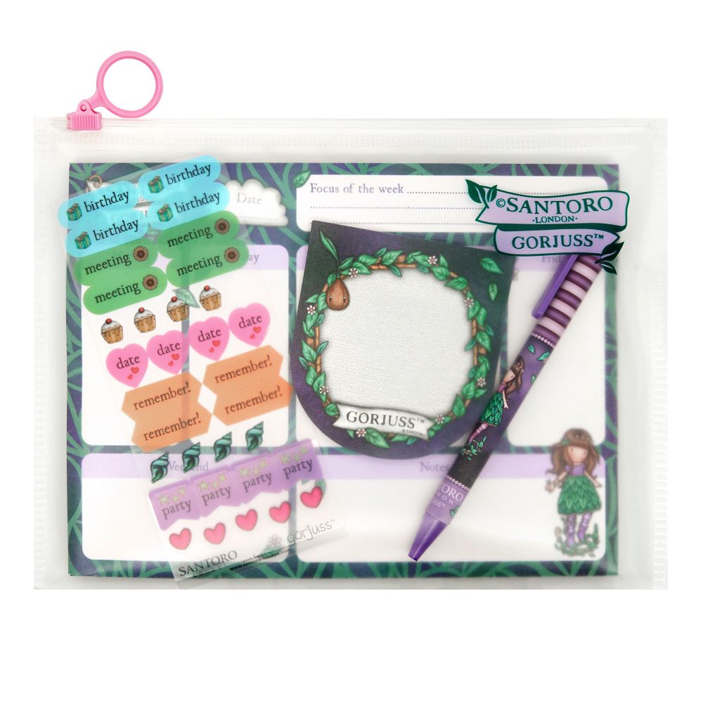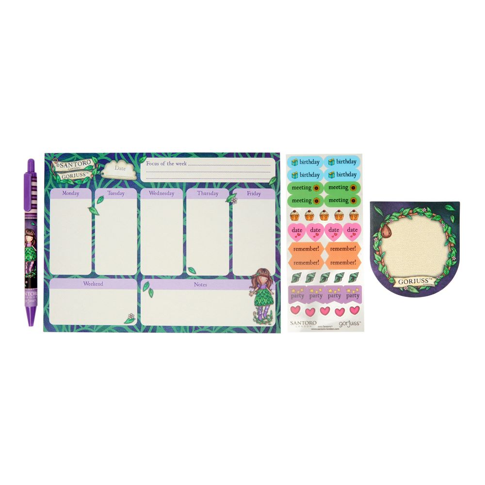 Сетът е в красив лилаво-зелен дизайн на листа, съответстващ на визията на "Земната фея" Gorjuss, от колекцията Elements. Състои се от 5 части: химикал, планер, лепящи листчета, мини стикери и прозрачен джоб с цип, в който да приберете всичко.