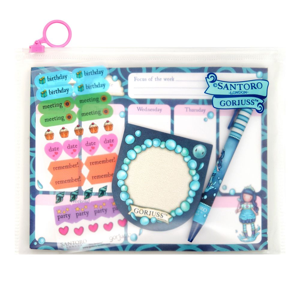 Сетът е в красив син дизайн на вълни, съответстващ на визията на "Ходещата по вода" Gorjuss, от колекцията Elements. Състои се от 5 части: химикал, планер, лепящи листчета, мини стикери и прозрачен джоб с цип, в който да приберете всичко.