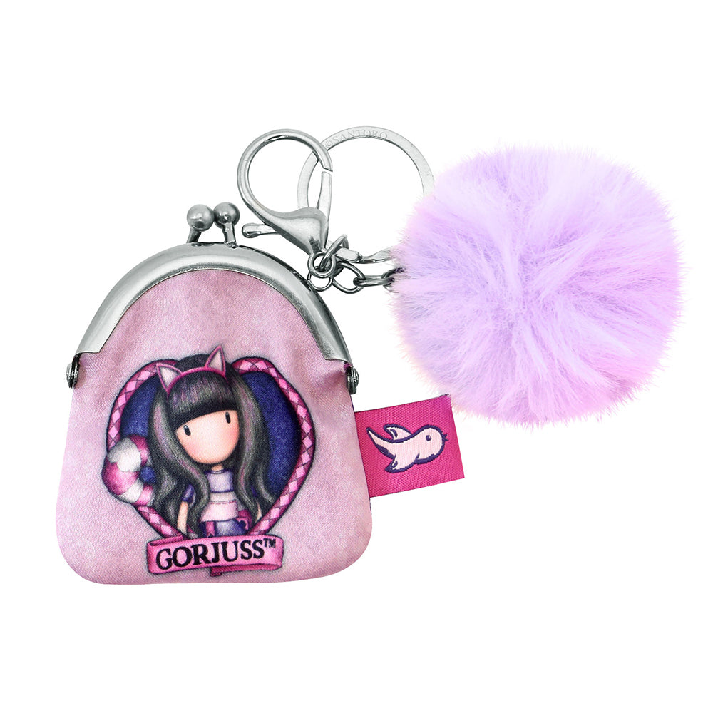 Притежава сатенен ефект. Има принт на Gorjuss момиче с котешки уши, розов етикет с птица и метален ринг. На металния ринг има украшение - пухкав лилав помпон. Подходящ е за закачане на ключове.