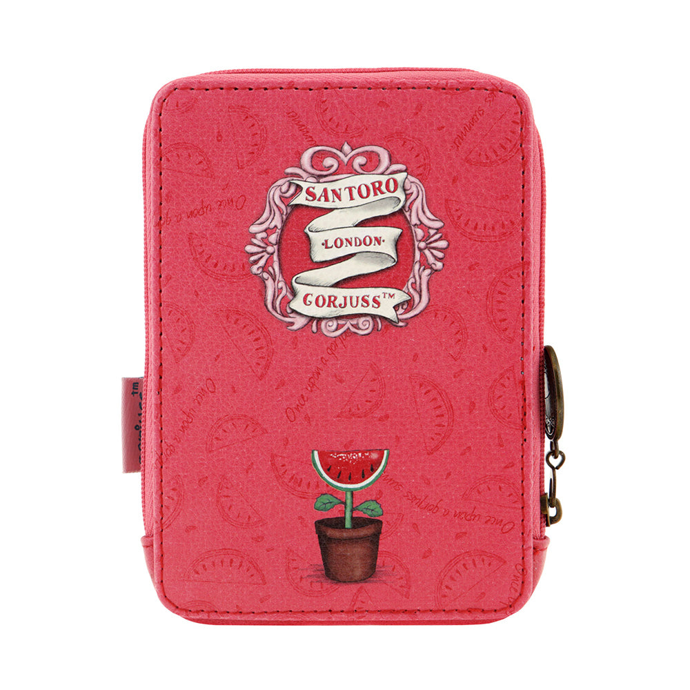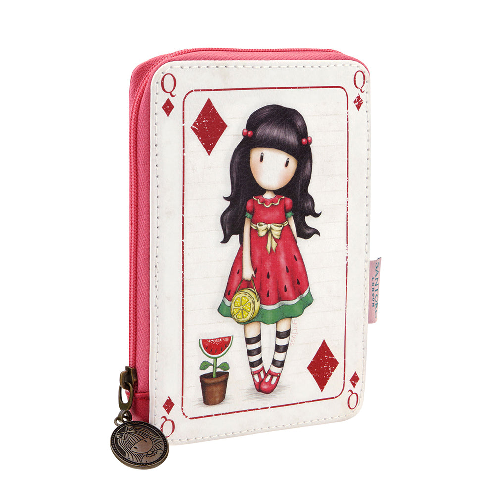 Малко правоъгълно портмоне с едно отделение, подходящо за съхранение на банкноти, стотинки и карти. Подплатата от вътре е изработена от 100% полиестер.Затворено със здрав, надежден цип с метален лакиран накрайник.Пришит етикет Santoro Gorjuss