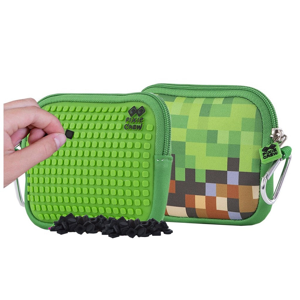 Принт на зелени, черни и кафяви блокчета. Здрава, неопрен материя за лесно почистване. Класически зелен силиконов панел Pixie Crew с пинчета за подреждане и кликване на черни пиксели. Здрав цип със зелен гумиран накрайник. Лек алуминиев карабинер за закрепване към гайка на колан.