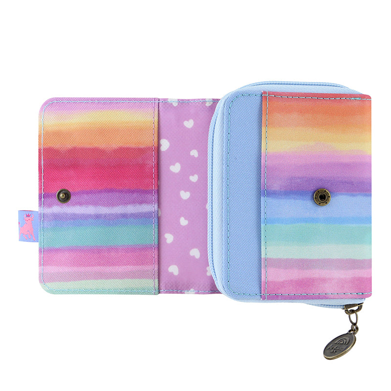 Многоцветното портмоне ,,Be Kind To Yourself” е идеално за събиране на пари, документи и дребни вещи. То има отделение за банкноти, две отделения, подходящи за карти и билети, и джоб с метален объл цип за монети. Закопчава се с метално копче, правейки портмонето по-сигурно.Размери: 10 х 12 х 3 см