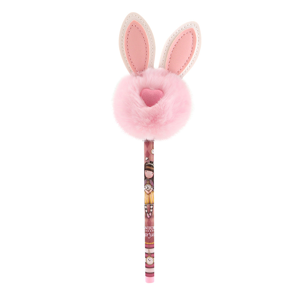 Пухкава писалка в розов цвят. Има страхотна и забавна капачка във формата на малко пухкаво зайче. Мастилото е в черен цвят. Върху писалката има принт на Gorjuss момиче.
