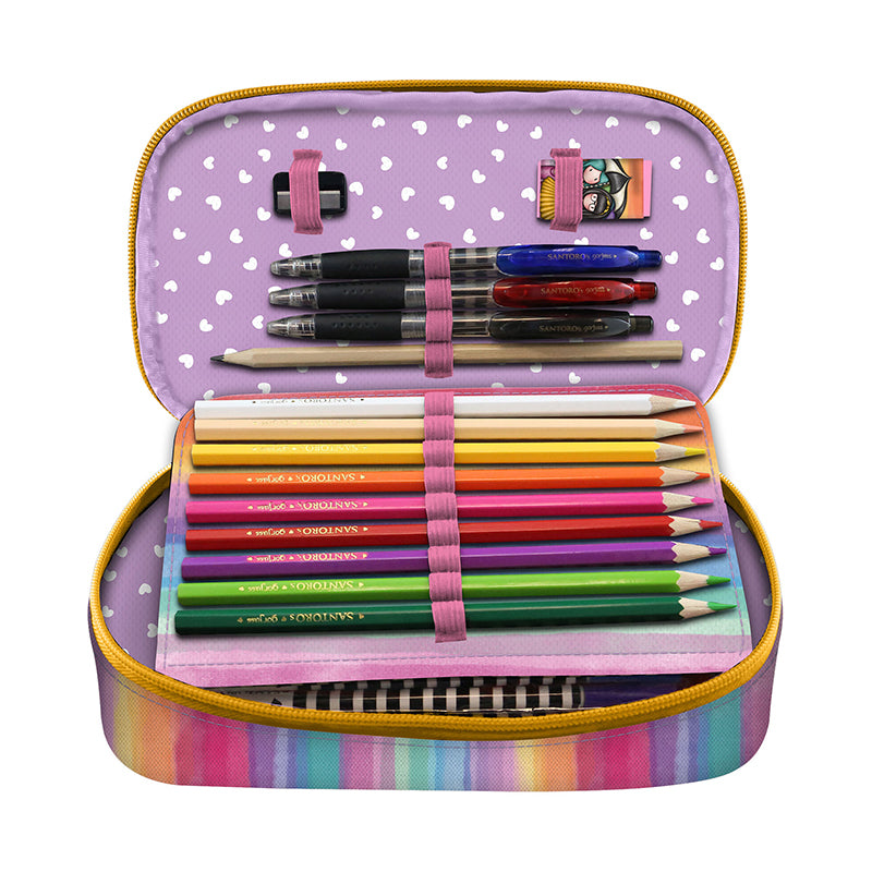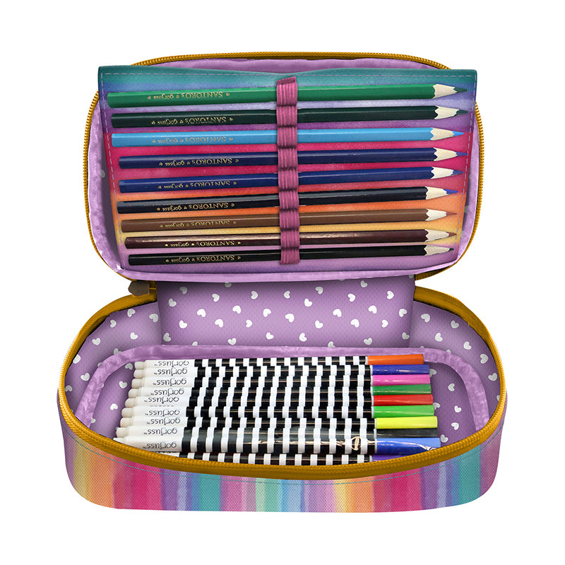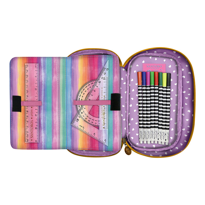 Пълният несесер Santoro Gorjuss ,,,Be Kind To Each Other”има всичко необходимо за вашето дете. Той разполага с 1 голямо отделение и в него са поставени ластични разделители, за да бъде лесно на ученика да поставя различни по размери химикалки и моливи. Несесерът идва с гума, острилка, три цвята химикалки, графичен молив, линия, триъгълник, транспортир, цветни моливи и фулмастри.Размери: 12.5 х 22 х 6.5 см
