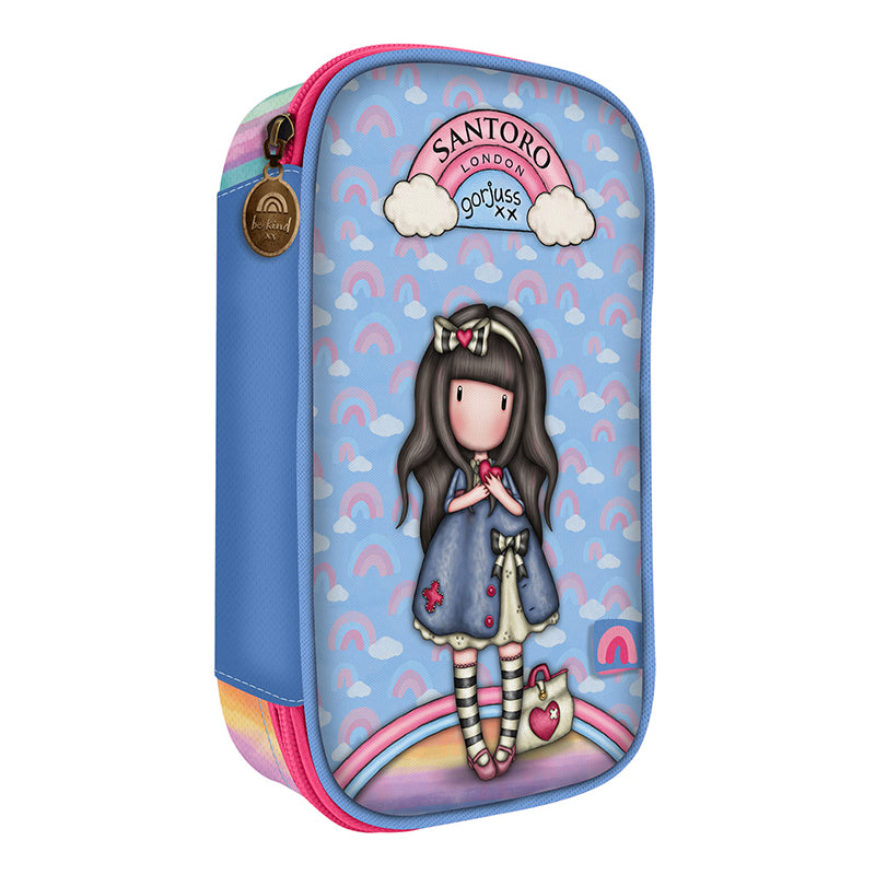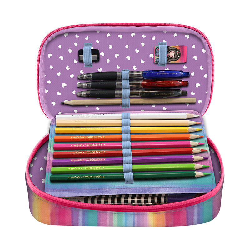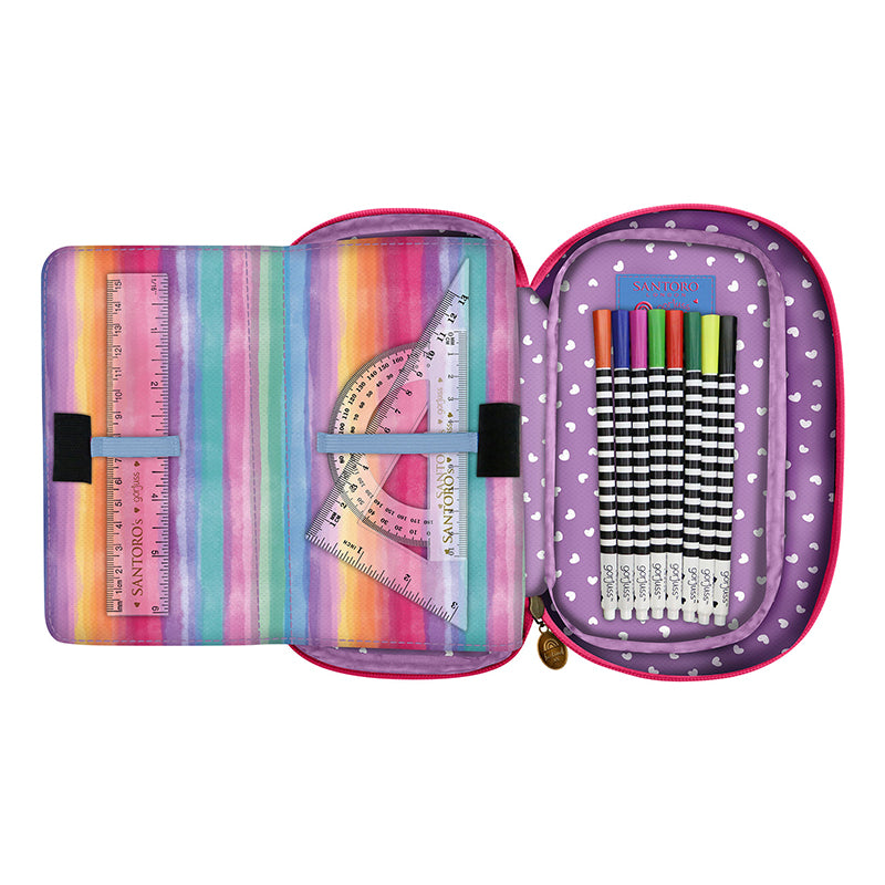 Пълният несесер Santoro Gorjuss ,,Be Kind To Yourself” има всичко необходимо за вашето дете. Той разполага с 1 голямо отделение и в него са поставени ластични разделители, за да бъде лесно на ученика да поставя различни по размери химикалки и моливи. Несесерът идва с гума, острилка, три цвята химикалки, графичен молив, линия, триъгълник, транспортир, цветни моливи и фулмастри.Размери: 12.5 х 22 х 6.5 см