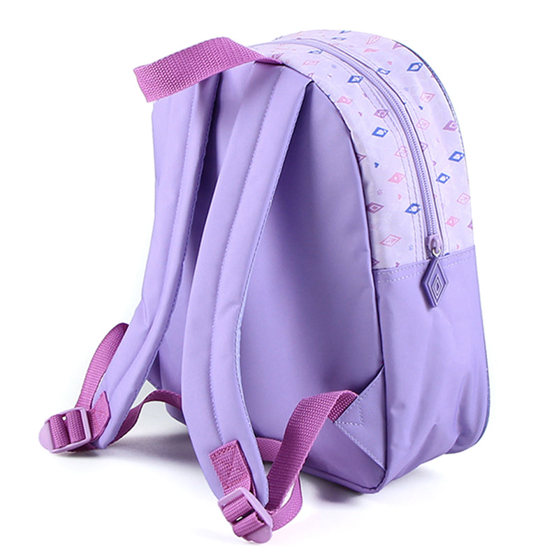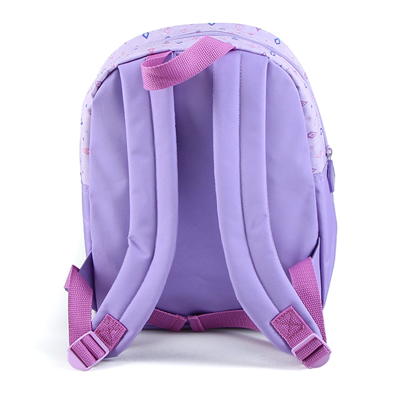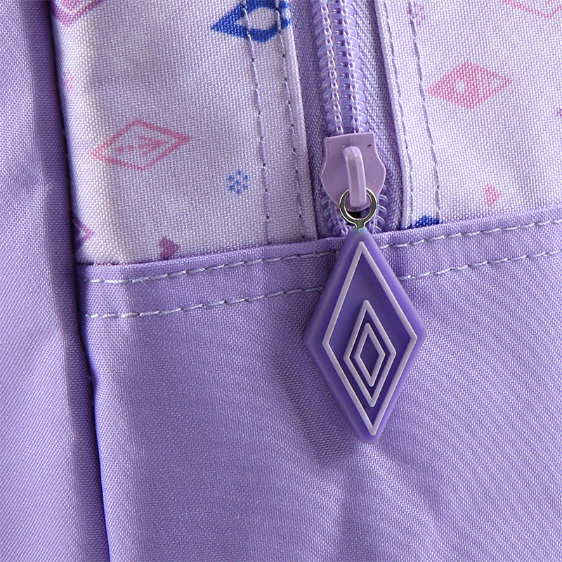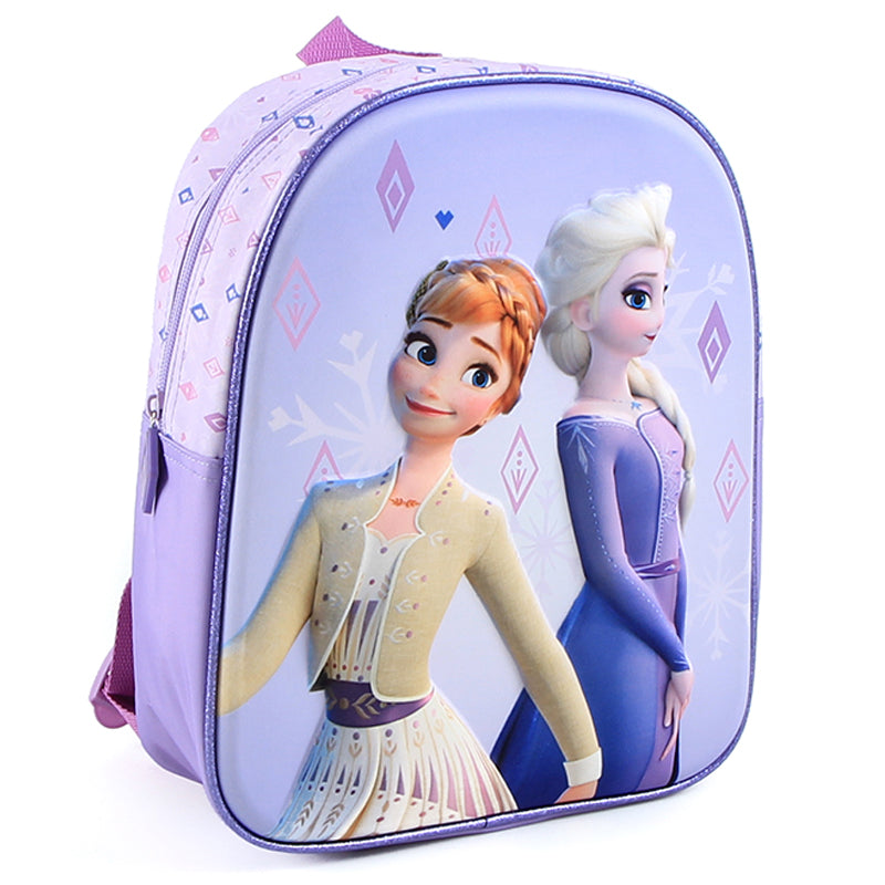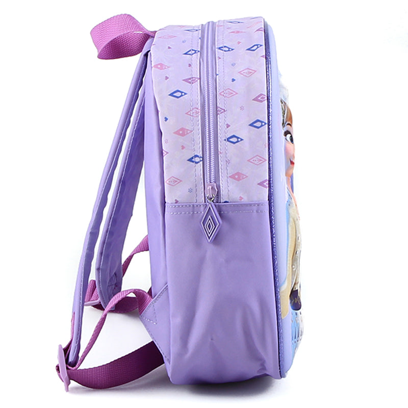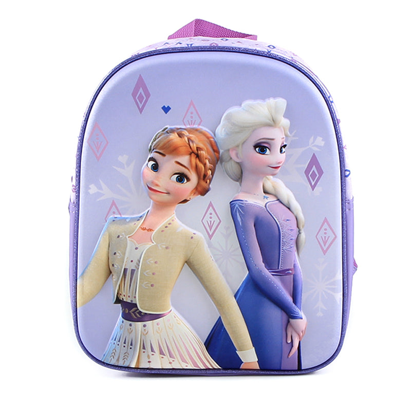Приказна раница за детска градина с единствено отделение от поредицата Замръзналото кралство. Събира всичко необходимо за посещение на детската градина. Здрав, стабилен цип с  гумен ромб накрайник. Раница, изработена от водоотблъскваща материя, която се почиства лесно. Качествен 3D обемен принт на Елза и Ана. Класическа цветова комбинация в нюанси на лилавото.