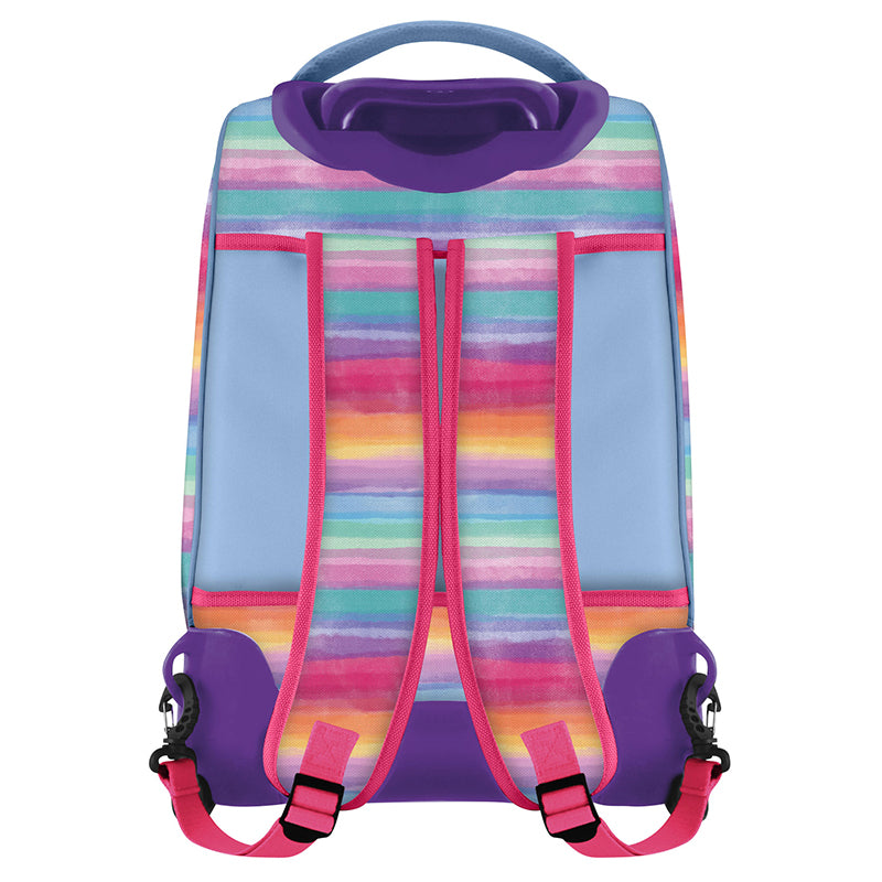 Стилната раница на колела Santoro Gorjuss ,,Be Kind To Yourself”е перфектна за пътувания и училище. Съдържа три големи отделения, като всяко едно се затваря с объл цип с логото на Santoro Gorjuss. Има отделение за лаптоп или таблет. В най-предното отделение има голям дълбок джоб, 5 отделения за карти/ дребни вещи и 1 отделение за химикалка/ молив. Закачен е гумен ключодържател с надпис ,, Be Kind”. Детето ви ще може да придвижва раницата, чрез колелцата закрепени към нея, както и да я носи на гръб.