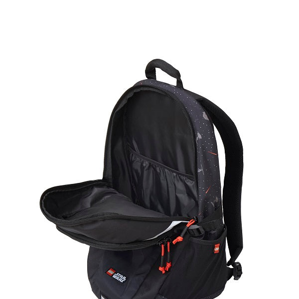 С две големи самостоятелни големи отделения, в които може да се поставят учебници и тетрадки и да съберете всичко необходимо за училище. В задното отделение може да се носи лаптоп или голямо форматни учебници до предпазващия твърд гръб. С удобни регулируеми презрамки, и допълнително закопчаване под гърдите. Странични мрежести джобове за бутилка за течности и други ученически принадлежности. Трети, преден джоб, пълен с мрежести и плътни малки прегради, затворени с цип за поставяне на химикали и ученически принафлежности. Четвърти, секретен джоб между голямото отделение и вентилирания гръб. Подходящ за бележник или други плоски пособия. Пети, секретен джоб под долната част на вентилирания гръб, който може да служи за портмоне. Култов преден панел с Дарт Вейдър. Ярко червени тематични връзки на всички ципове. Щампи на имперски изтребители и лазери по плата между отделенията.