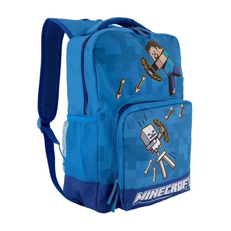 Малка раница за малките геймъри! Тя е за феновете на Minecraft и разполага с едно отделение, затварящо се с цип и удобен преден джоб, който ще събере най-необходимите дребни аксесоари. Страничните мрежести джобове са подходящи за бутилки или плод. Подплатените презрамки са регулируеми, а дръжката е удобна за носене.