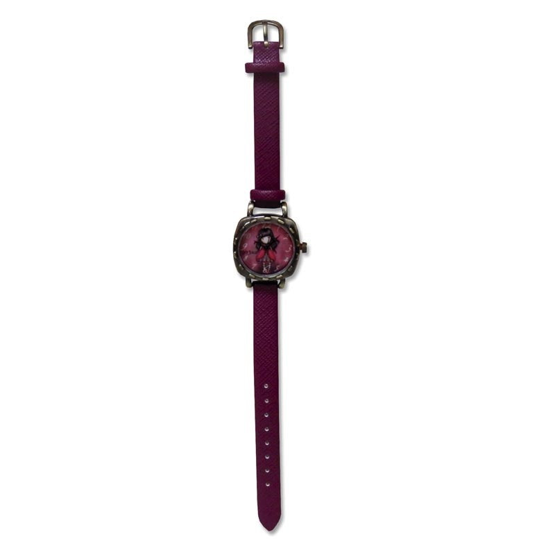 Очарователен винтидж часовник с корпус от неръждаема стомана с диаметър 28 мм и дебелина 7 мм. Корпусът е кръгъл, с полиран метал и минерално стъкло, устойчиво на надраскване. Циферблатът е с лилав принт на Gorjuss момиче и сребристо бели арабски цифри,.