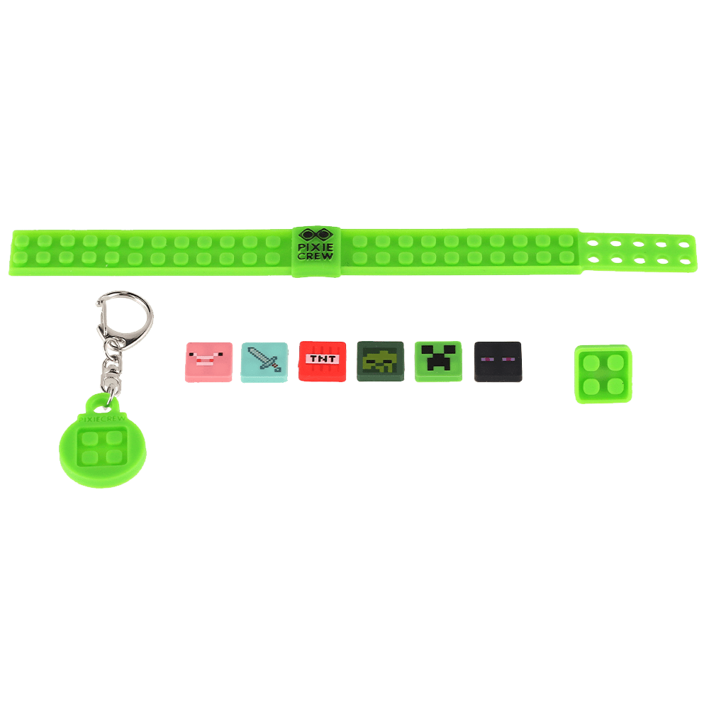Сет от зелена силиконова гривна пиксели Minecraft Pixie Crew, ключодържател и пинче. Дължината на гривната се регулира, за да пасне на китката на всяко дете. Шест броя мулти пиксели на Minecraft Pixie Crew – зомби, криипър, ендермен, диамантен меч, TNT и прасе.