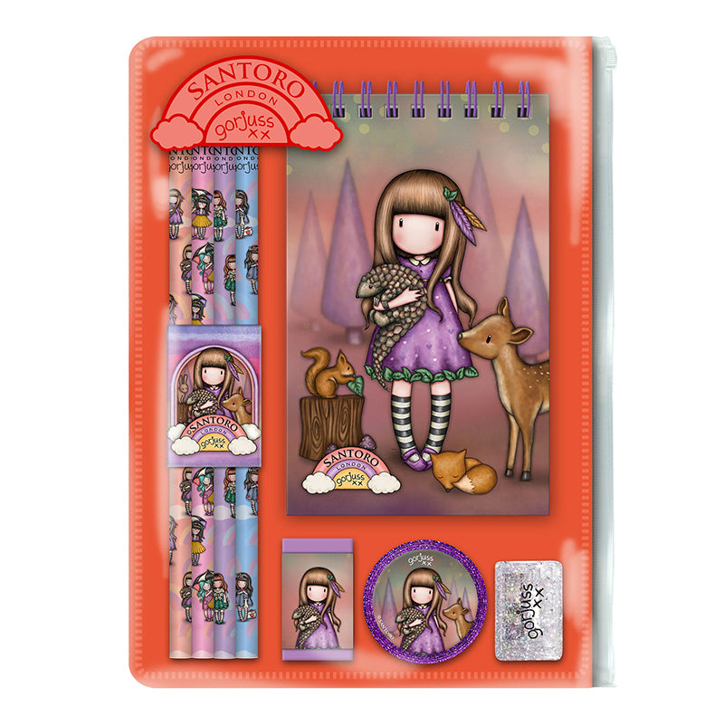 Сетът с ученически пособия Santoro Gorjuss "Be Kind To All Creatures" има всичко важно за училище. Съдържа 4 графични молива, острилка, гума, тиксо и тефтер. Тиксото е с брокат и е лилаво на цвят.