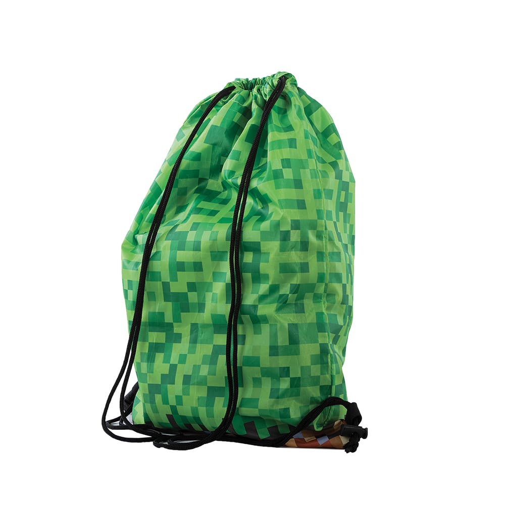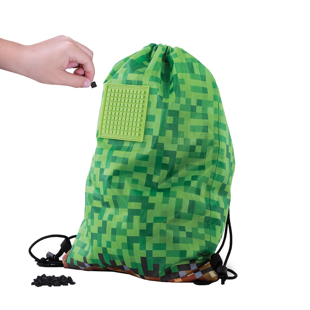 Интересната спортна торба е от марката Pixie Crew, което означава, че крие и някои изненади - в предната си част има силиконов панел, на който се редят пиксели и се създават картини. В комплекта има пликче с черни пиксели. Във вътрешната част на торбата има джобче, а затварянето е посредством връзки, които се използват и за презрамки.