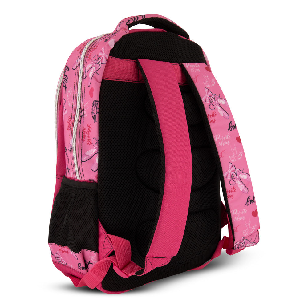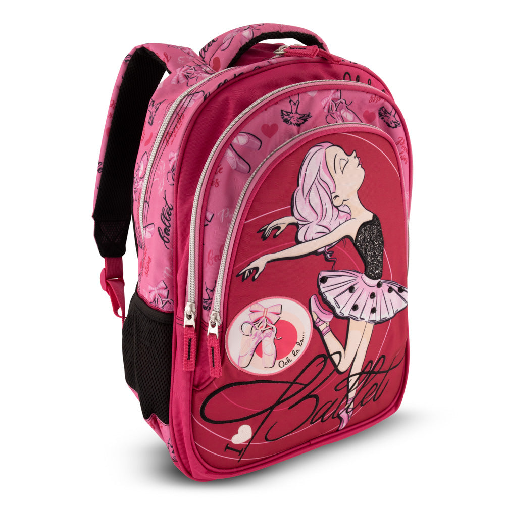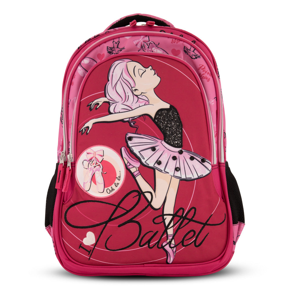 Основният цвят на раницата е розов, разнообразен с разноцветни надписи и бродиран черен надпис Ooh la la... на втория панел. Нашивка на две балетни обувки и надпис Ooh la la..., бродиран надпис I love Ballet и красива, изящна балерина с елегантна пачка с черни диаманти и добавен черен брокат.