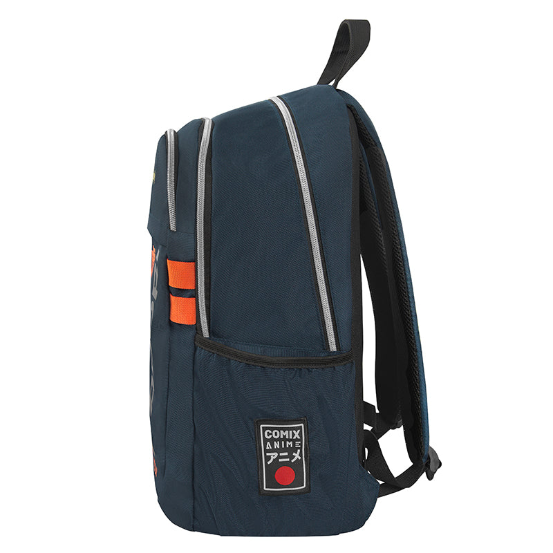 Здрави, странични джобове за бутилки за вода. Висококачествена нашивка с надпис Comix Anime върху дясното отделение за вода.Здрава, промазана, водоотблъскваща материя за лесно почистване. Надеждни, здрави шевове.Вентилиран анатомичен гръб с полета от обемна пяна. Регулируеми, чрез катарами, дишащи презрамки.Удобна черна дръжка. Подсилено дъно, също от изолиращата пяна.